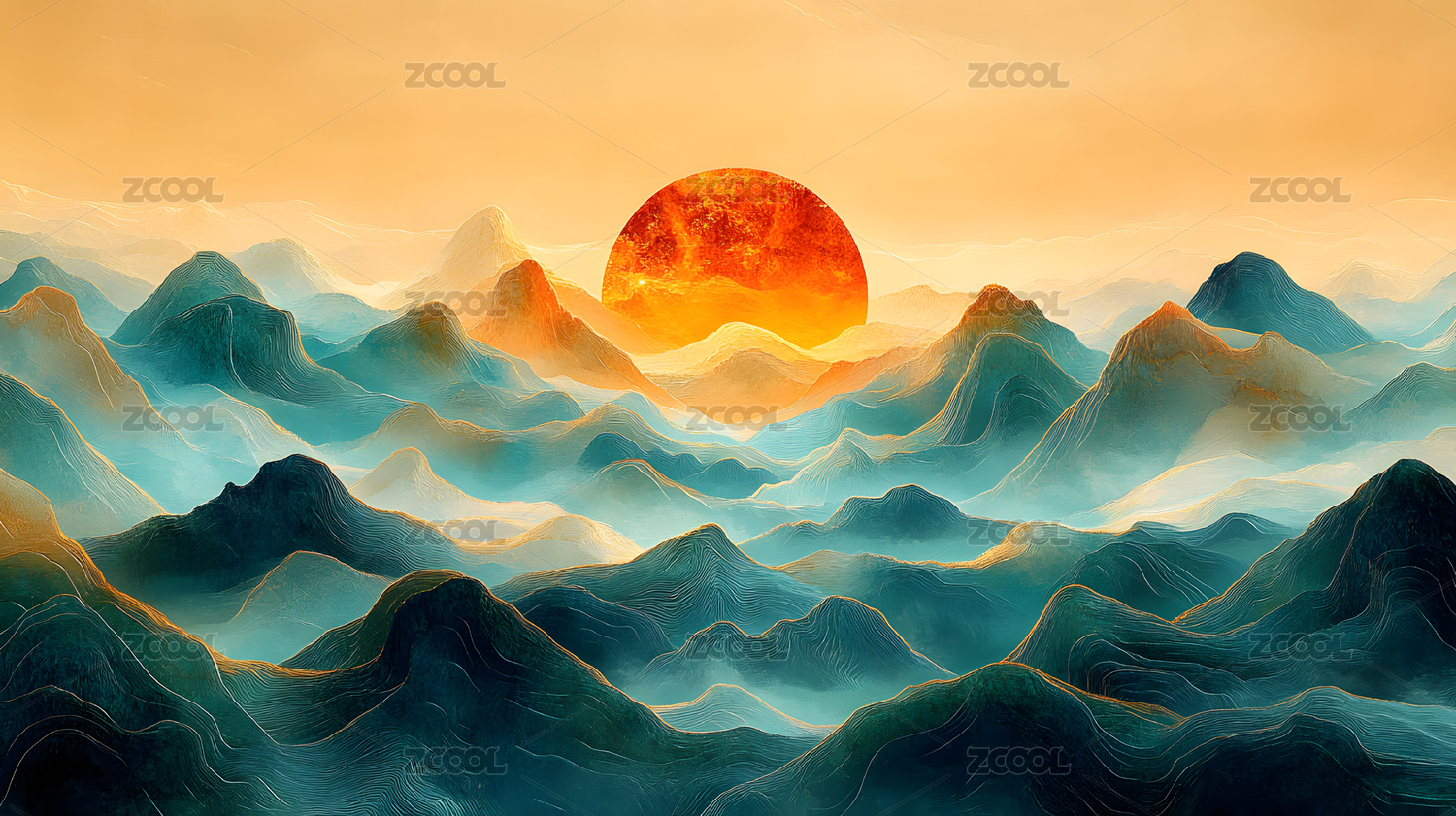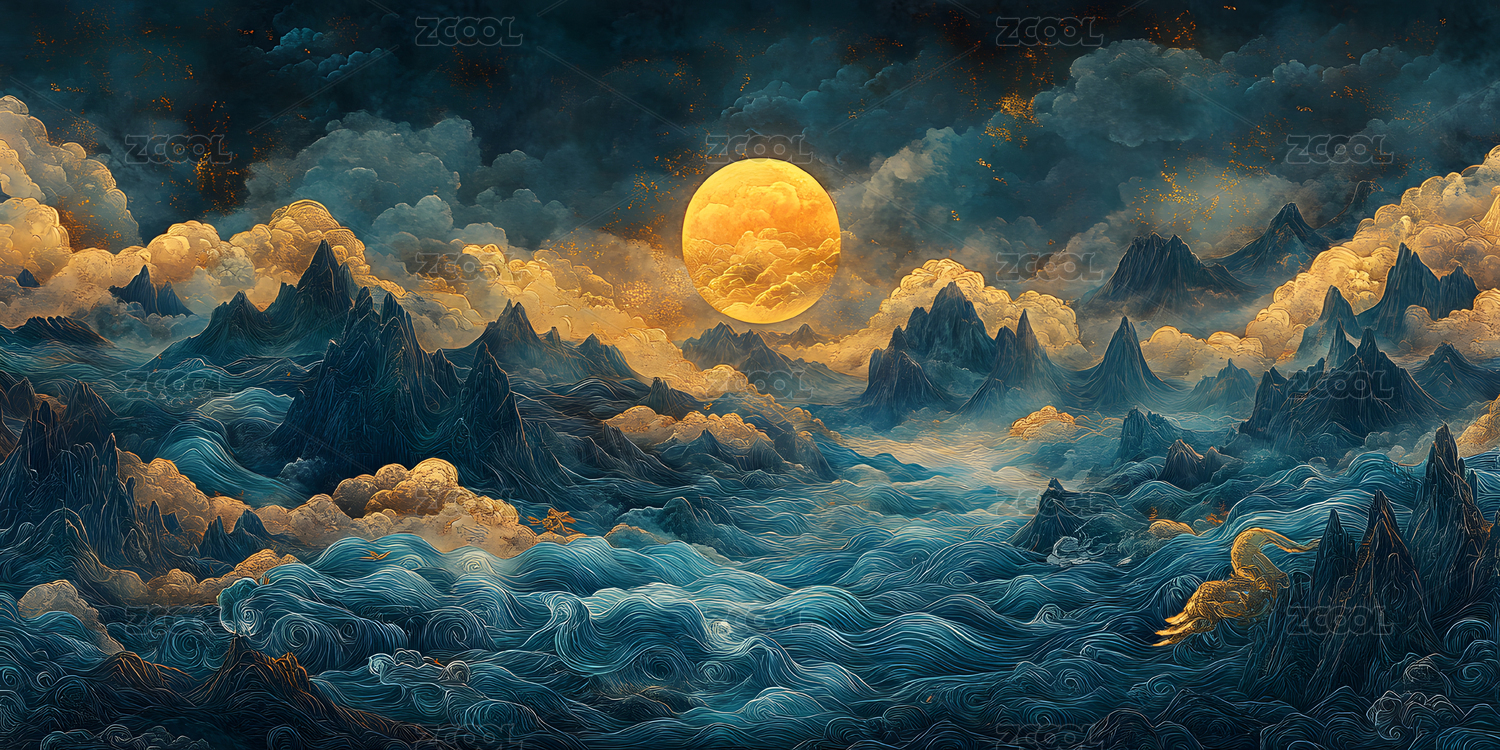 国风新中式轻奢日出山水画