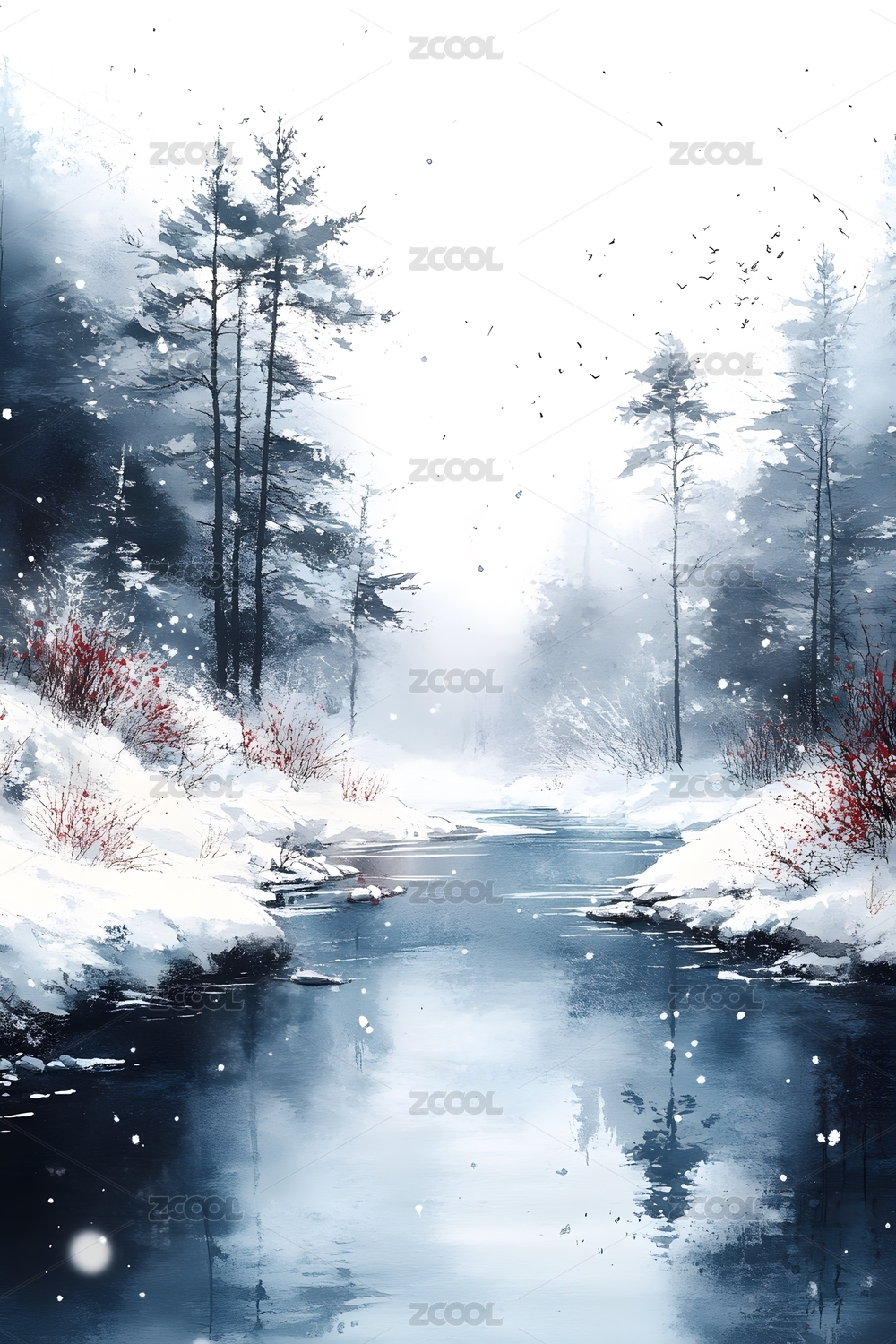 中国风冬天雪花高山风景水墨插画