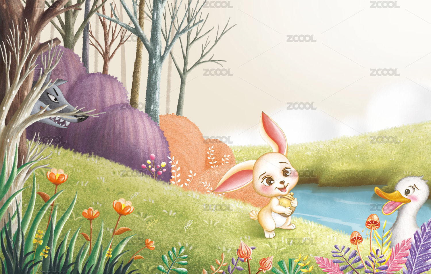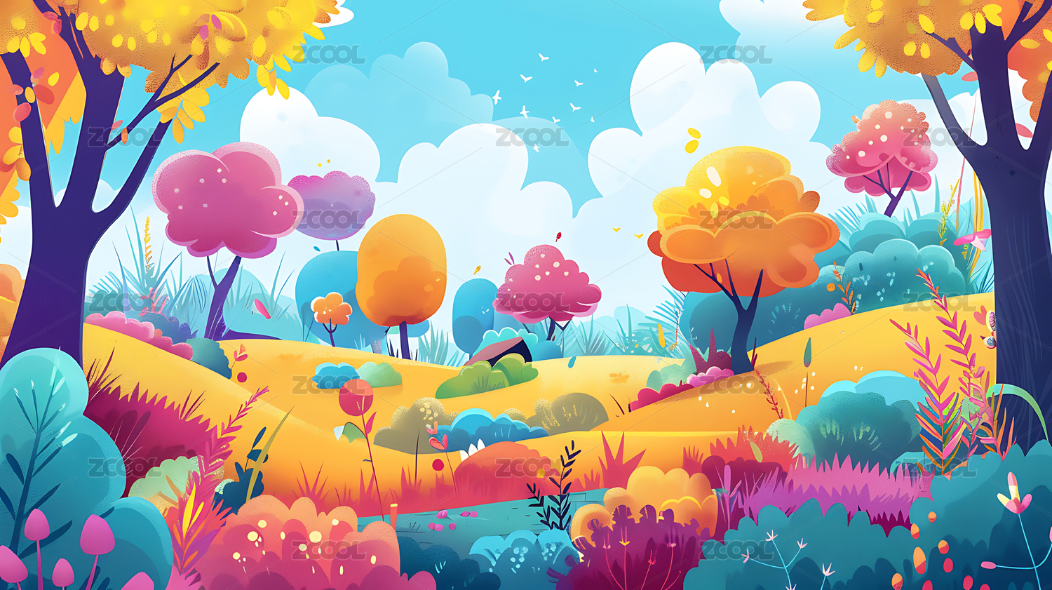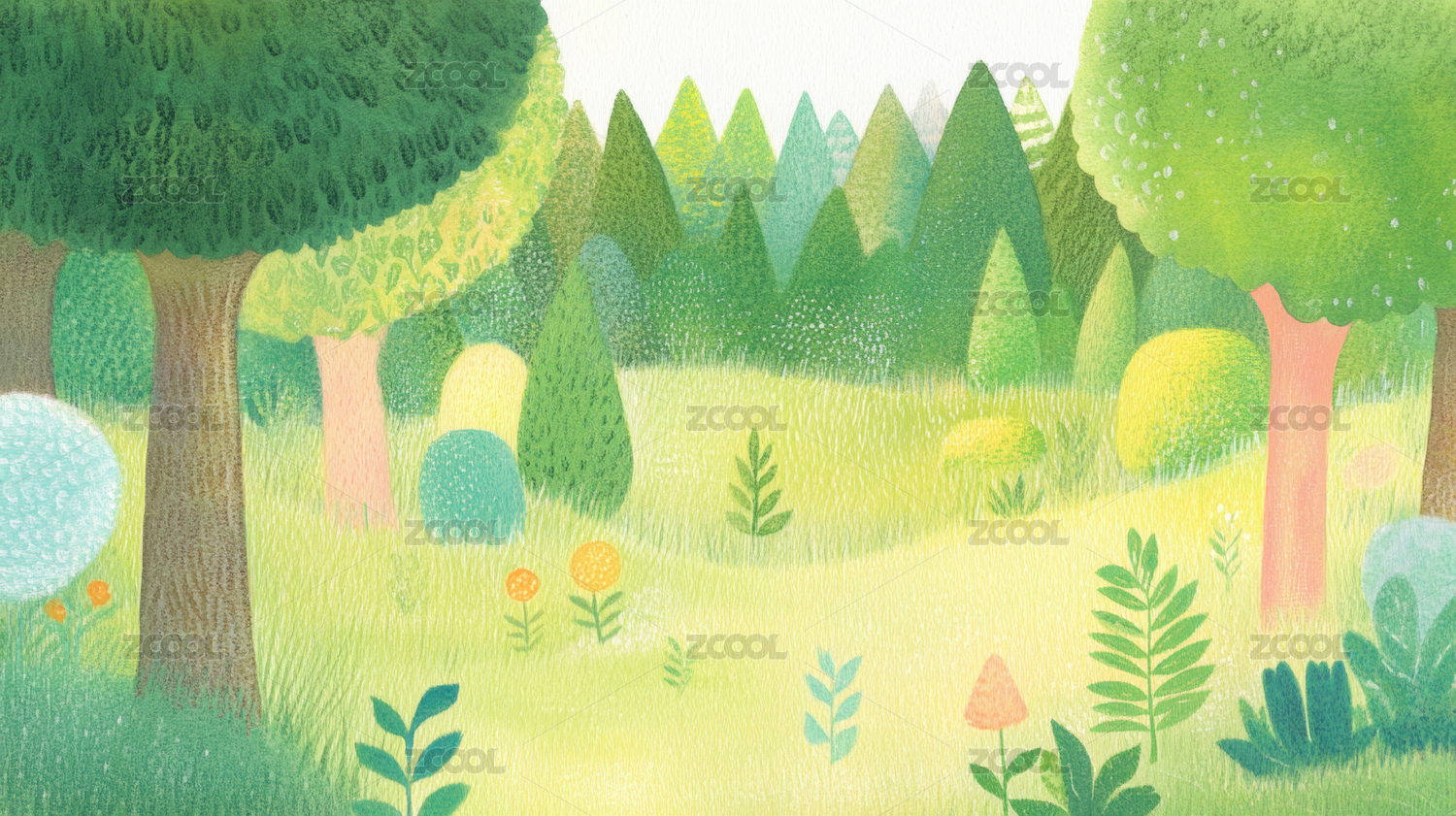 绿色的树林和花草,儿童绘本,卡通风景插画