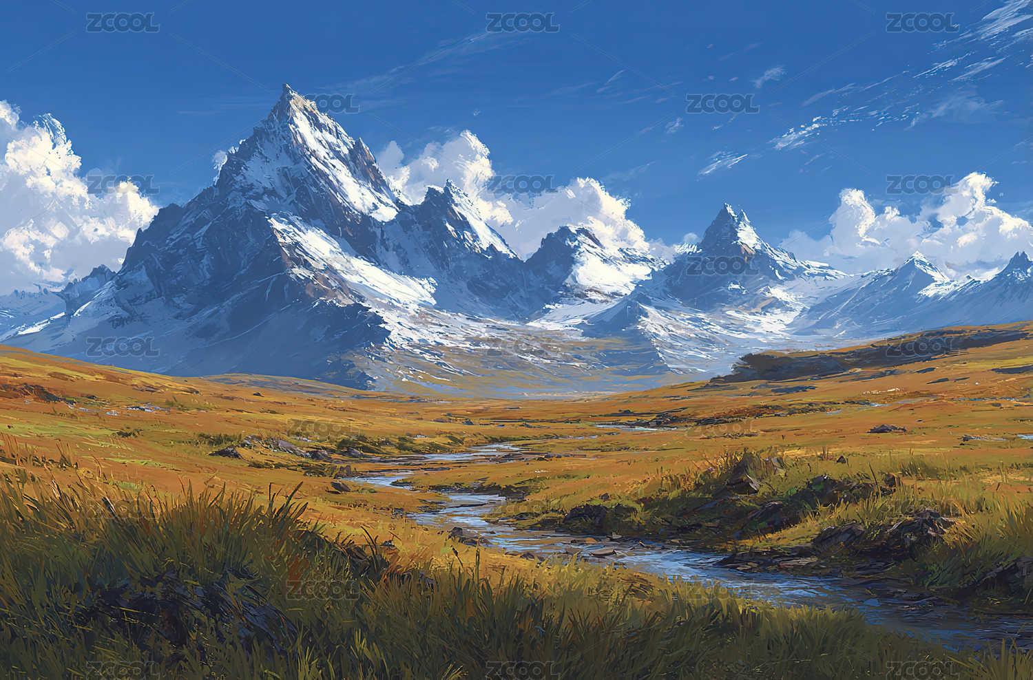 雄伟,山脉,草地,溪流,风景,户外,装饰画,自然,唯美,油画