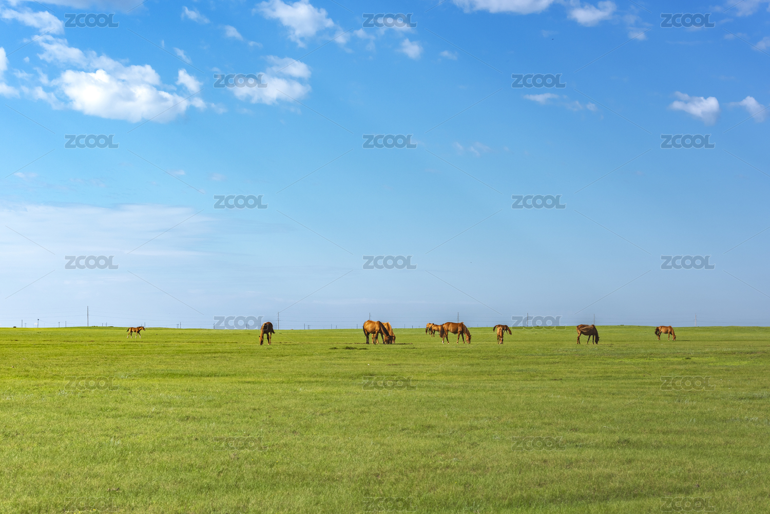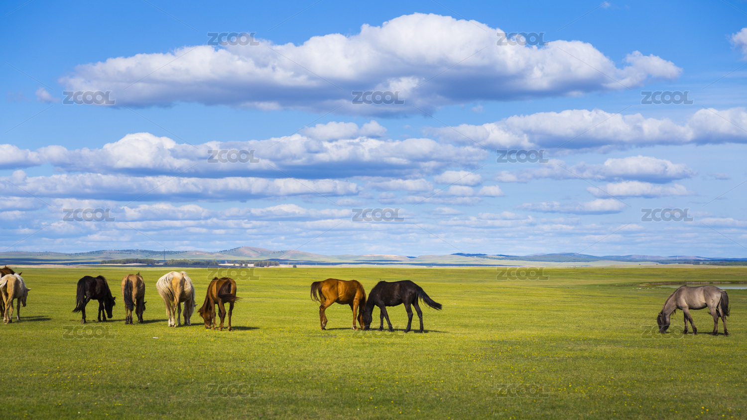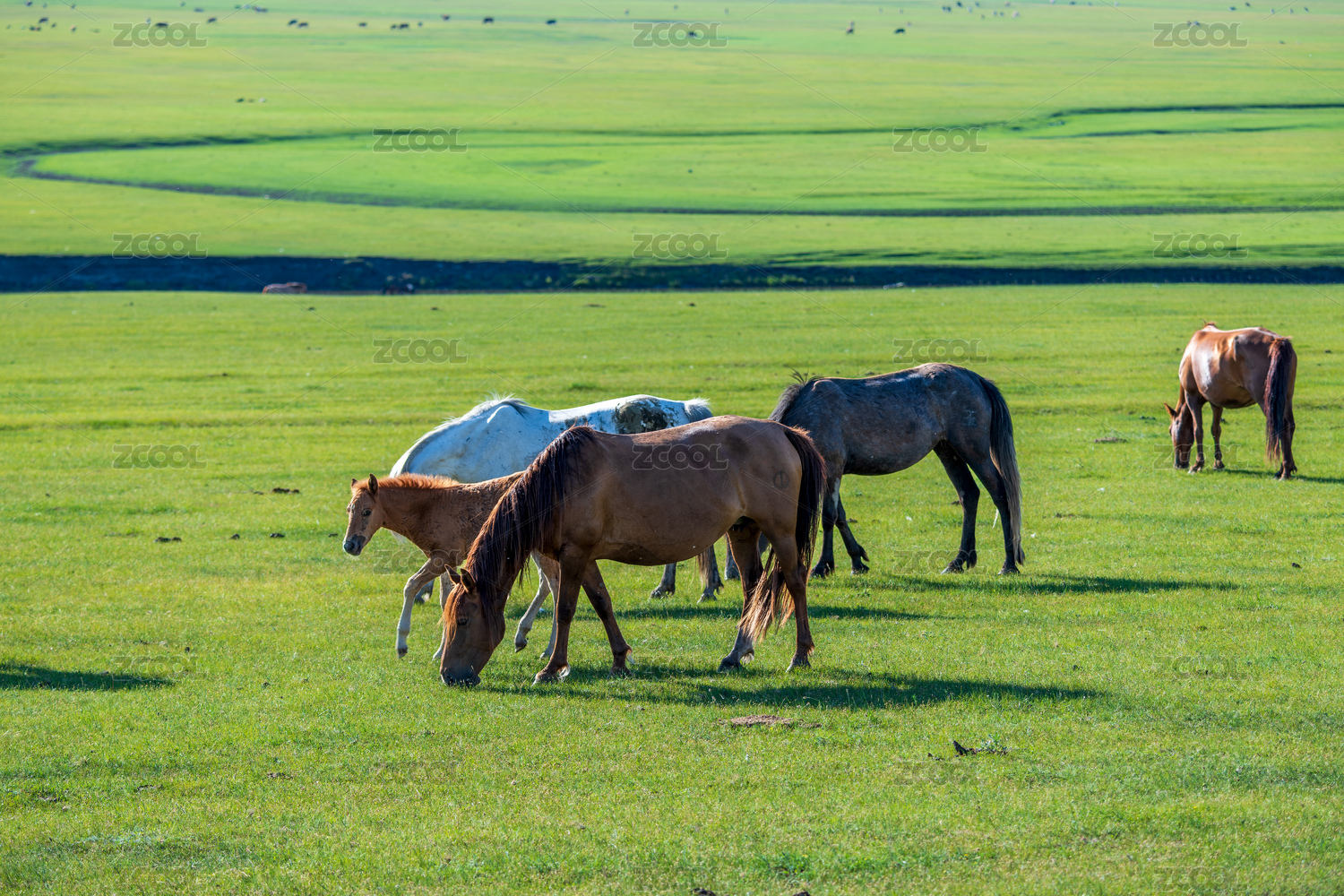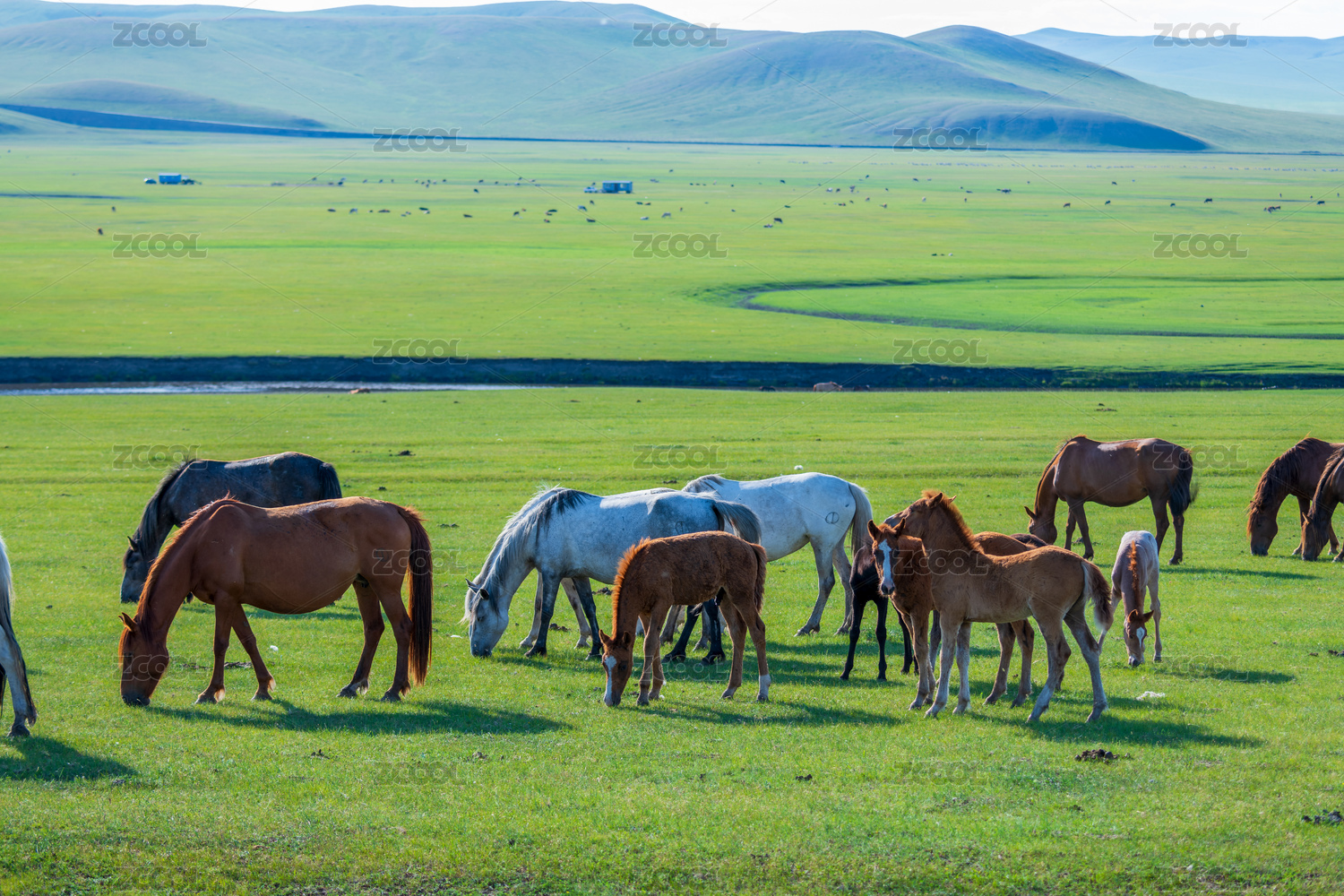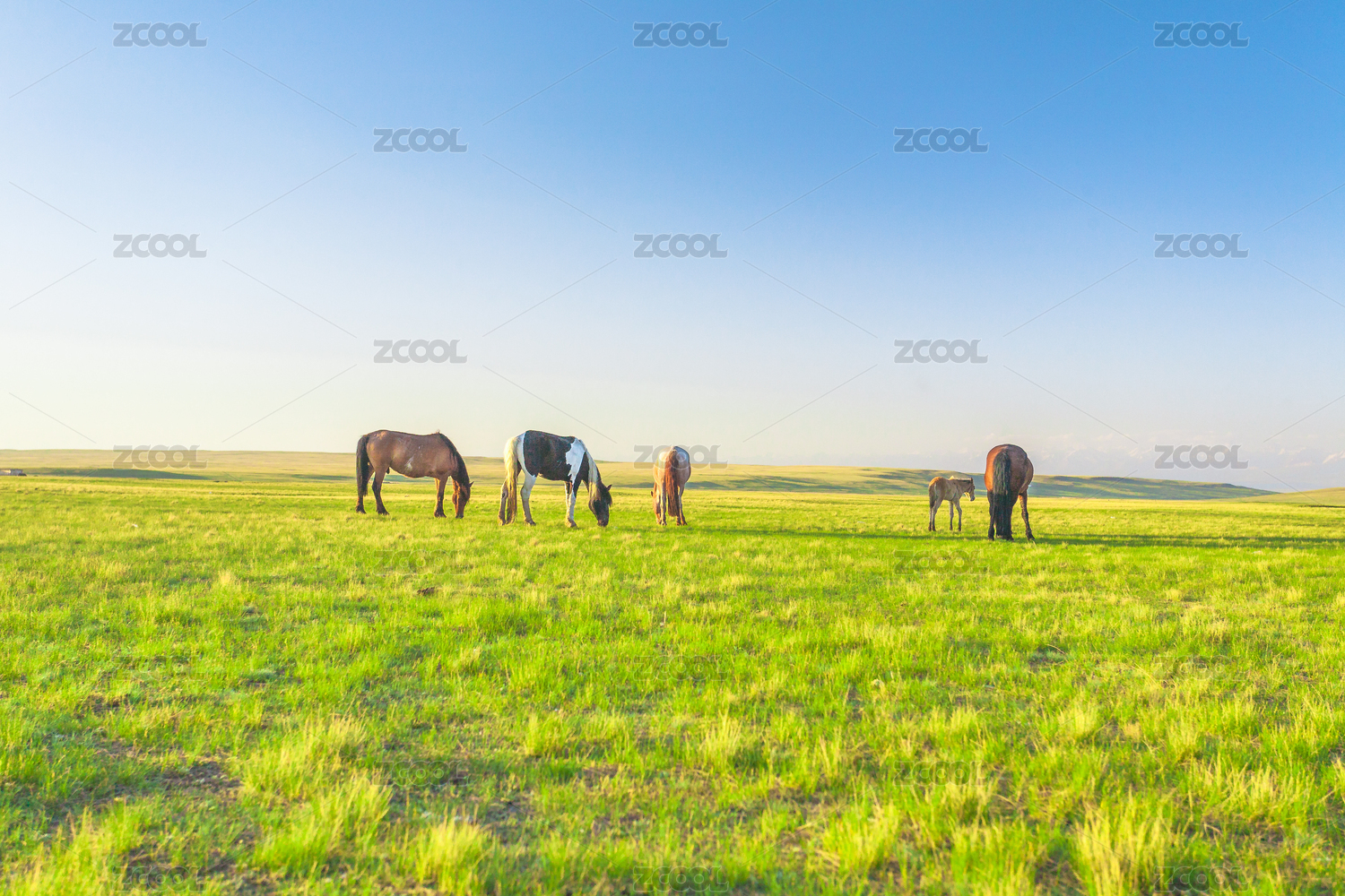 清晨正在内蒙古呼伦贝尔草原上吃草的马群