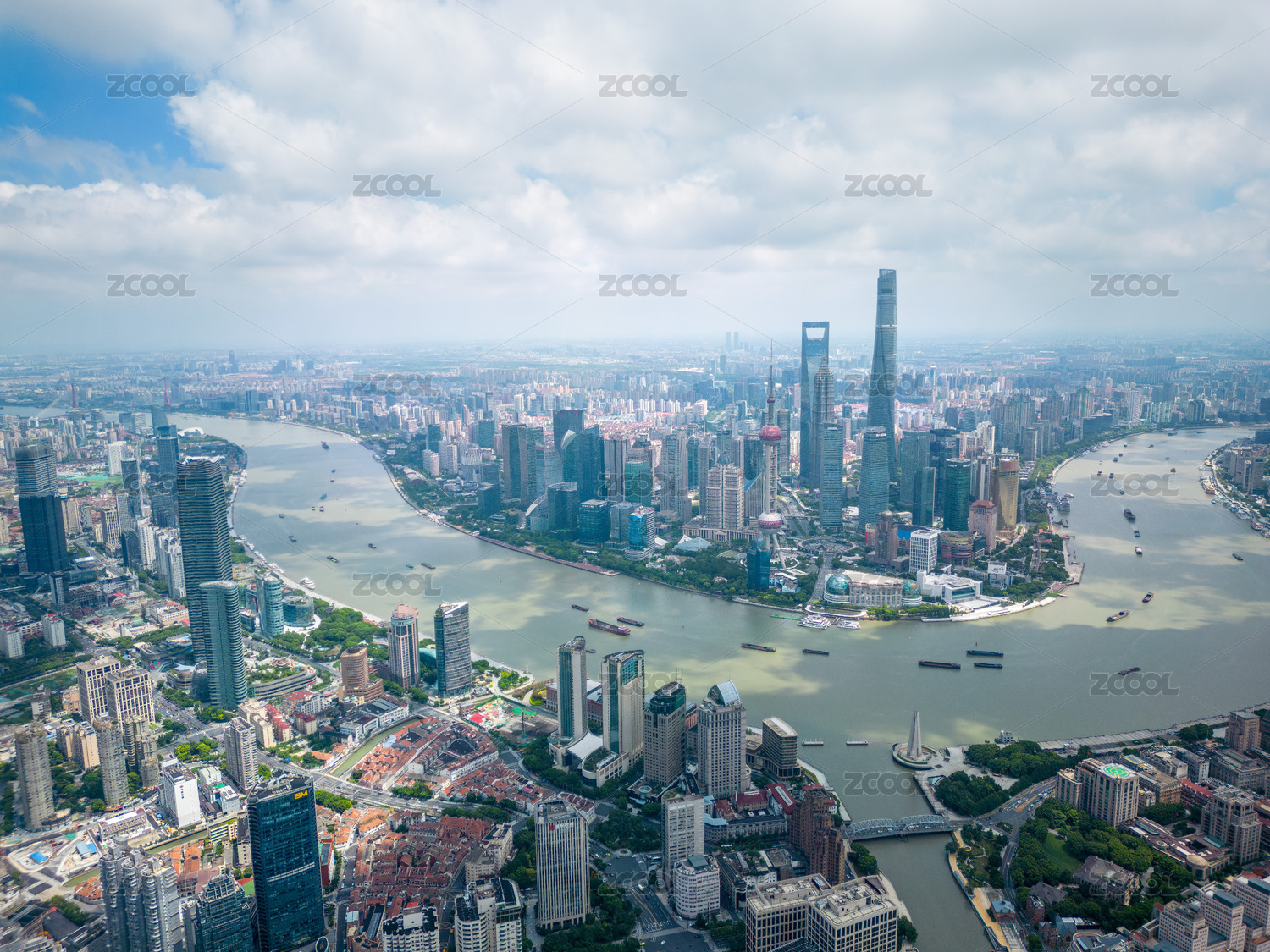 航拍的上海城市旅游地标建筑景观——陆家嘴金融自贸区的摩天大楼