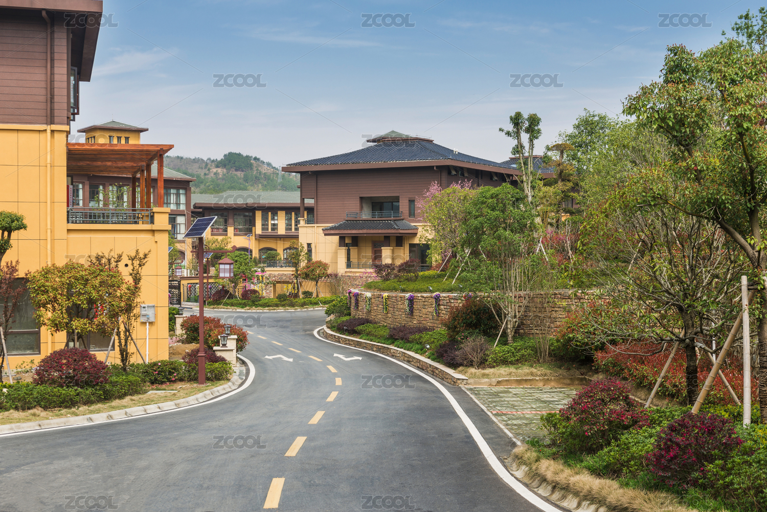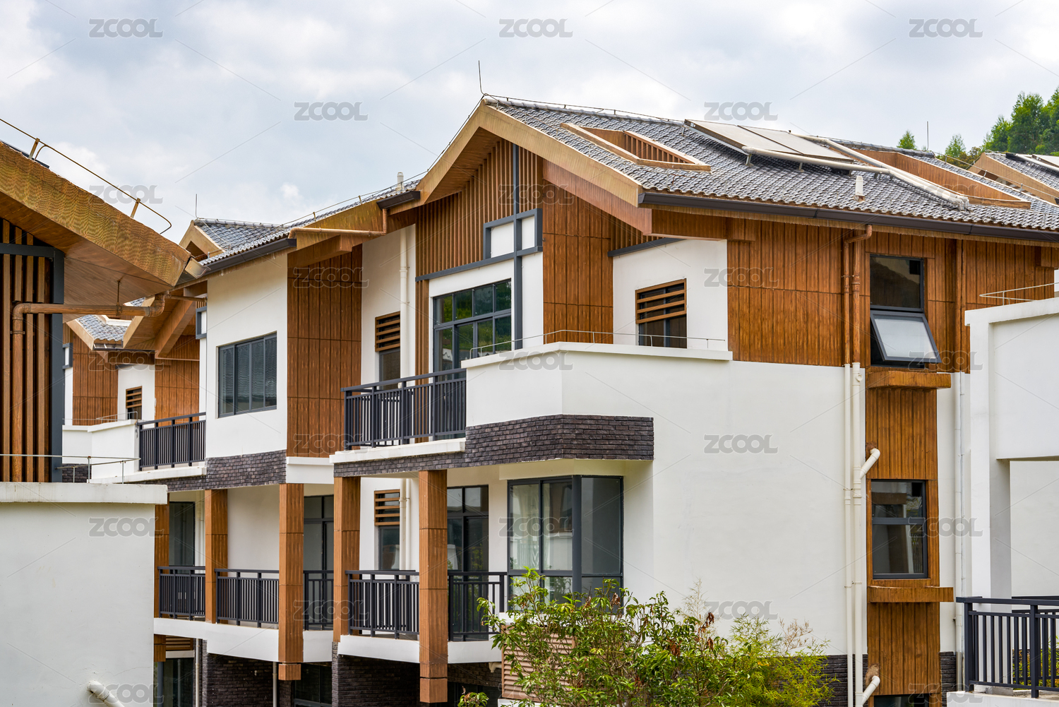 一处豪华的中式房地产联排别墅区景观