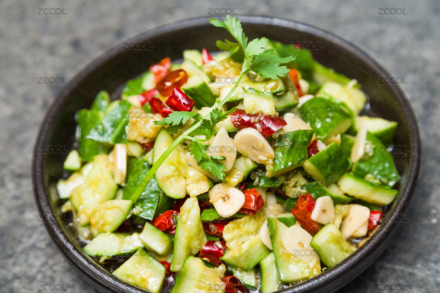 青色碗盛装的家常小菜凉拌黄瓜