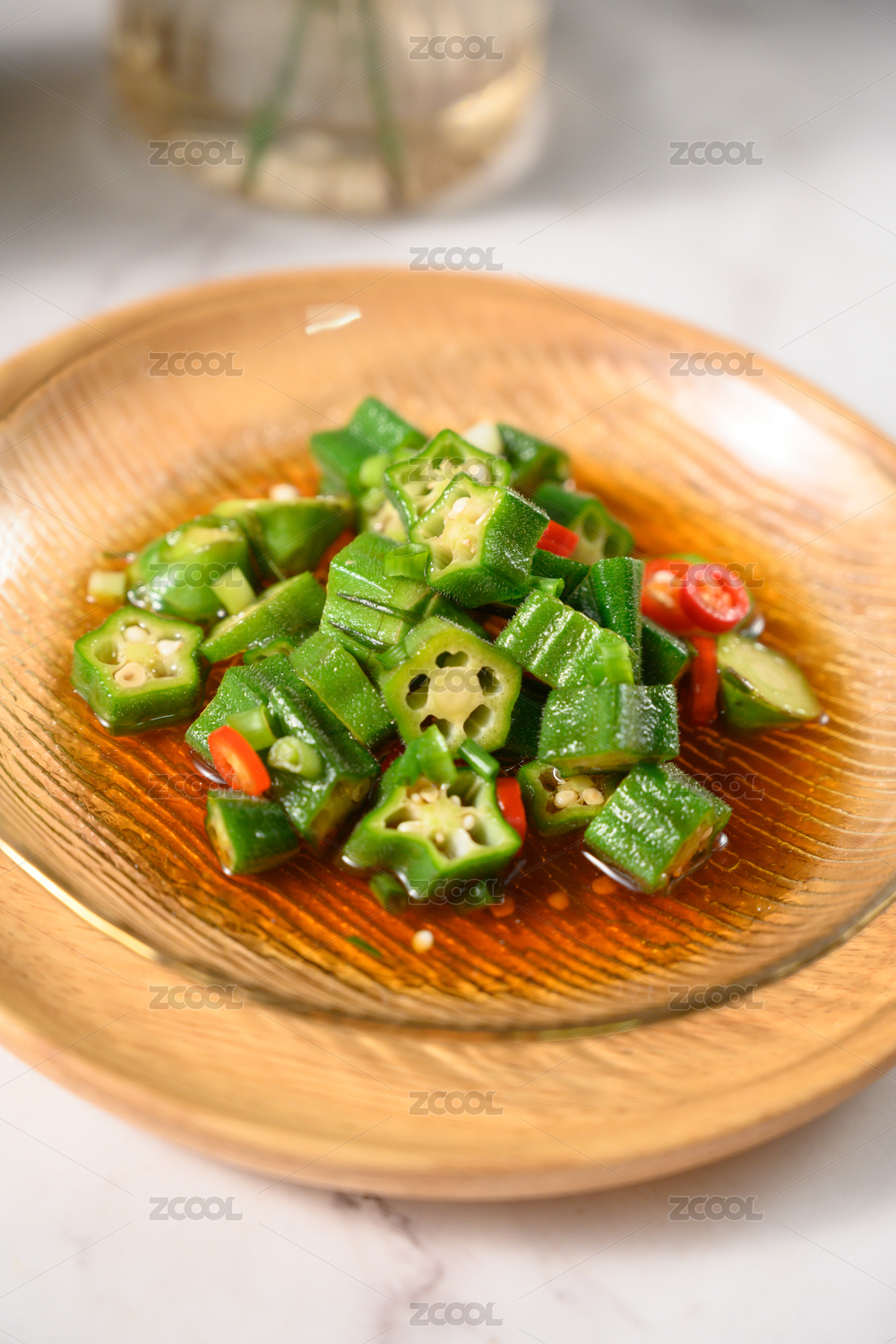 桌面上的盘子里的美味可口的凉拌秋葵