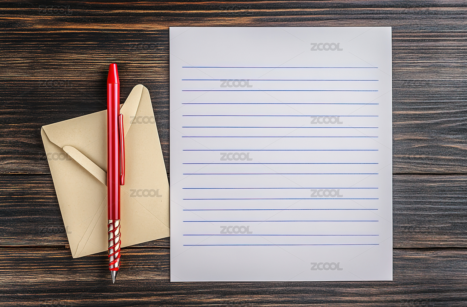 放在木桌子上的牛皮纸信封和空白信纸和钢笔