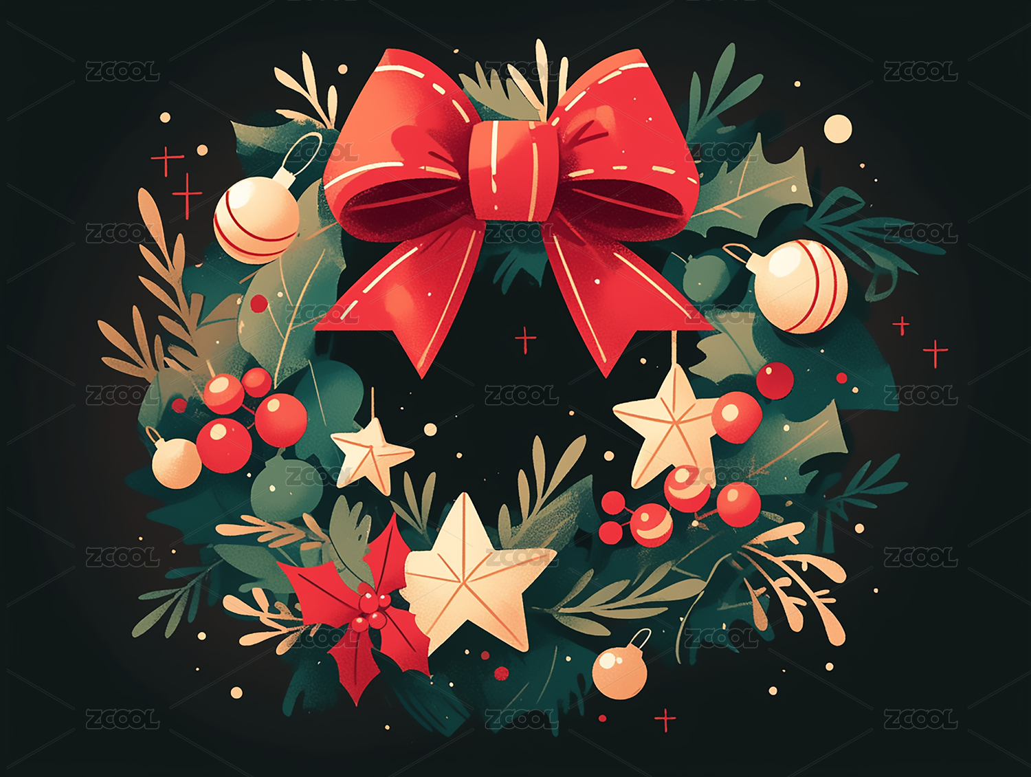 扁平噪点深色圣诞节圣诞花环卡片贺卡插画