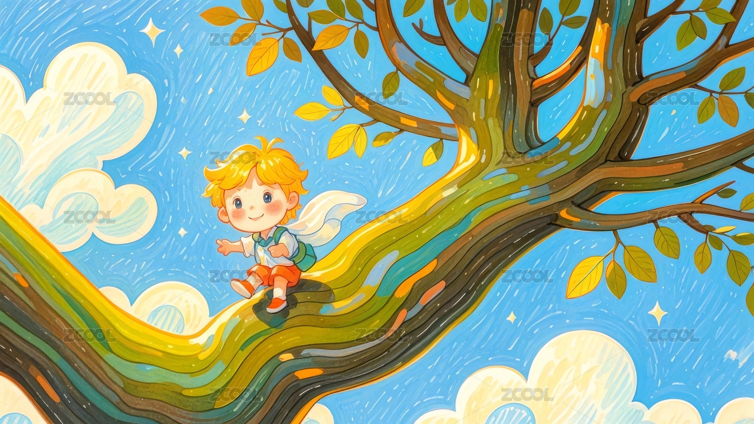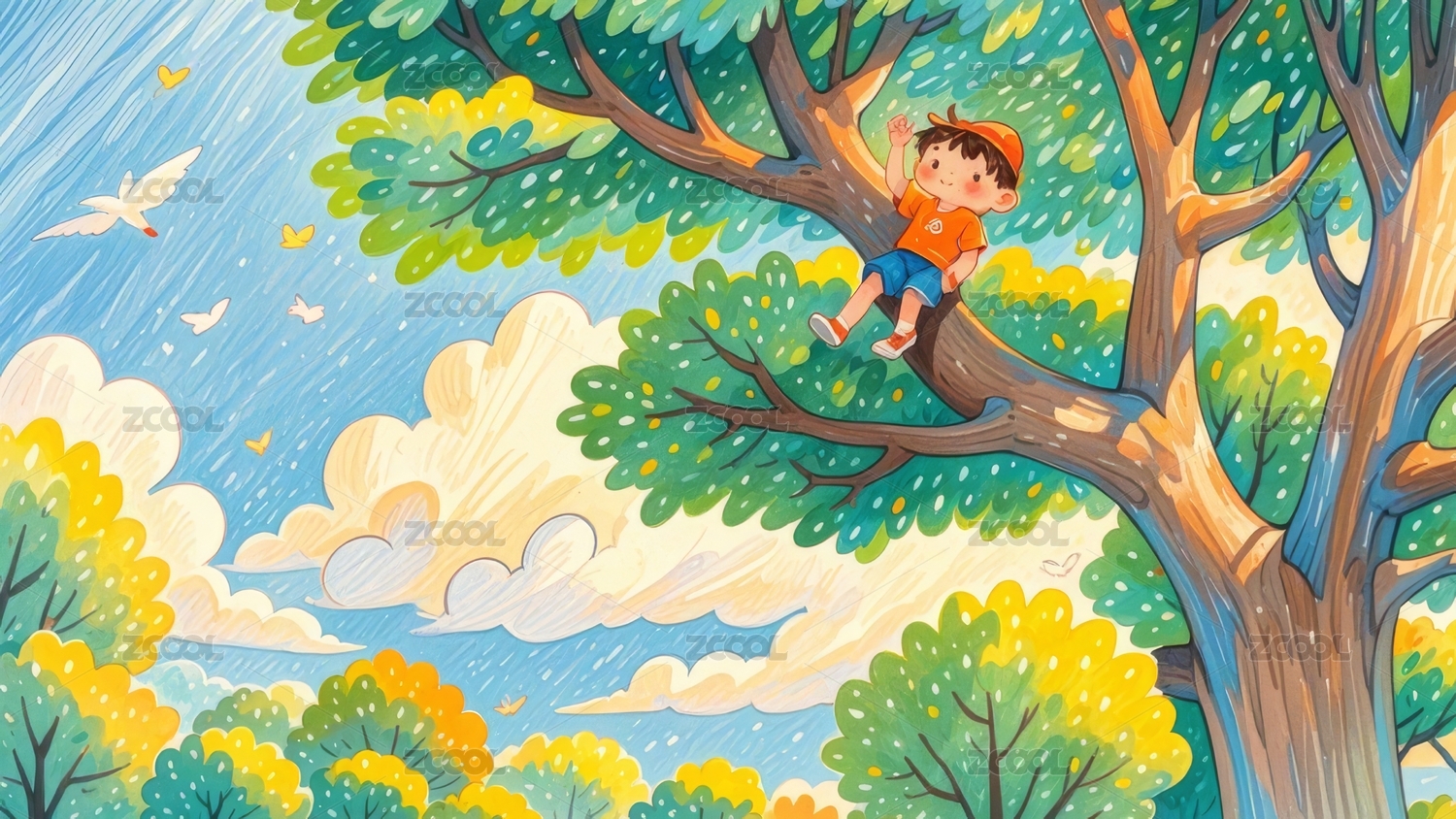 温暖手绘-坐在树上看书的小男孩
