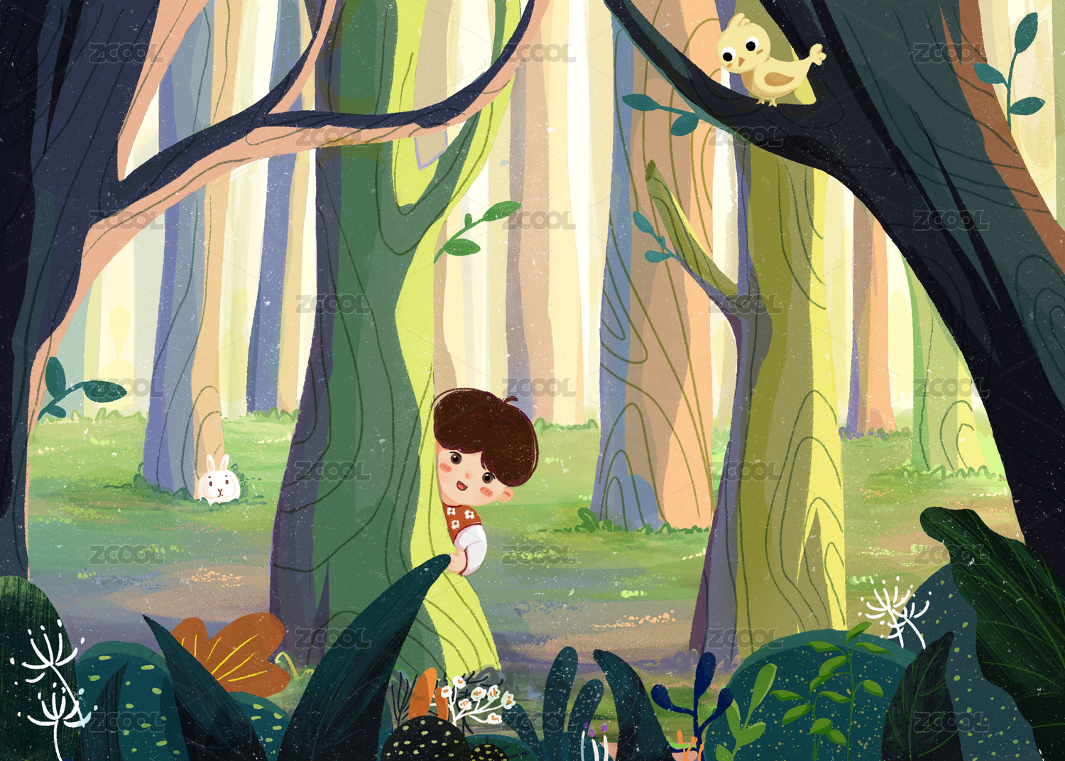 小男孩在森林里玩捉迷藏