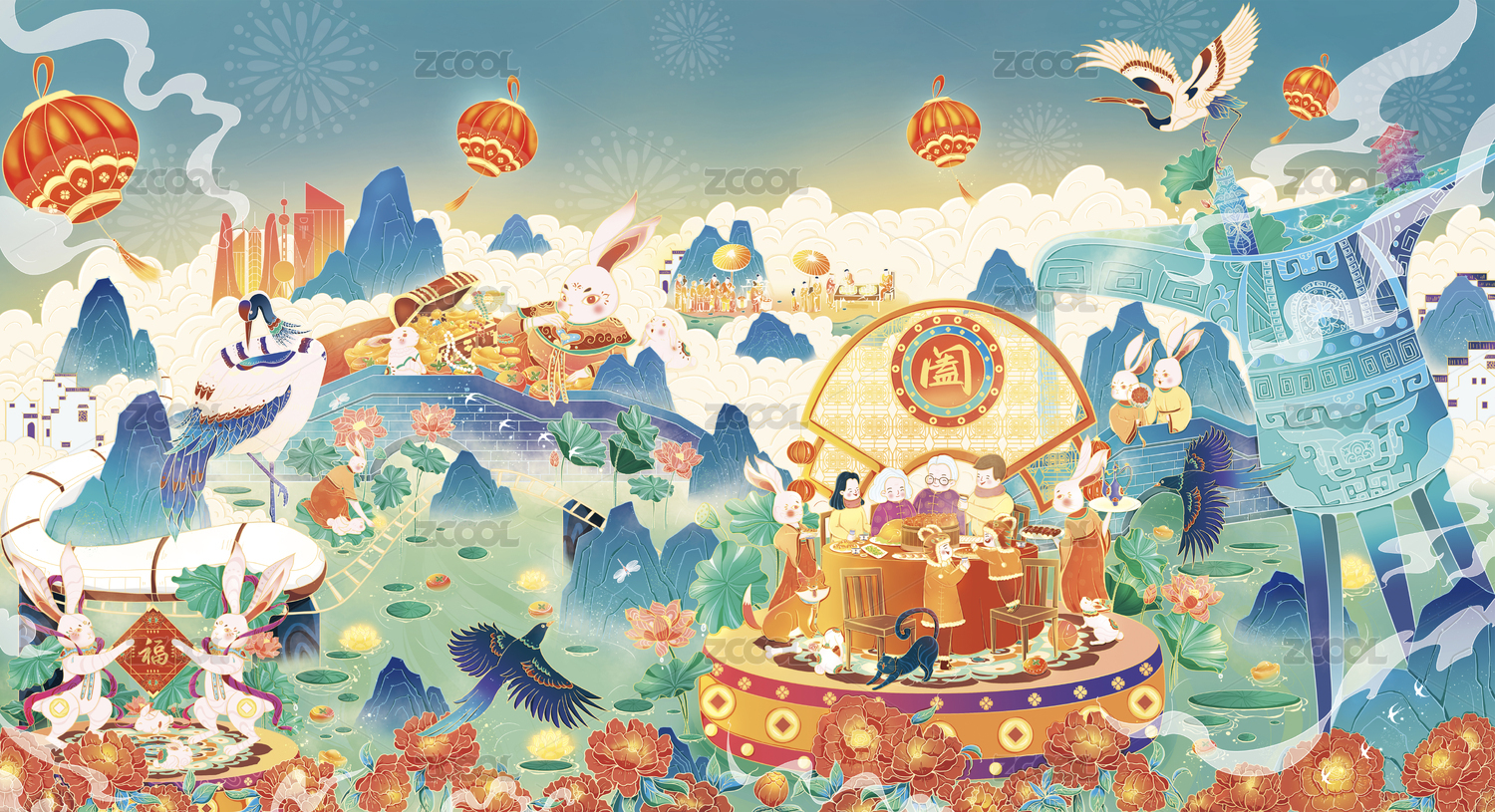 瑞兔贺春国潮插画