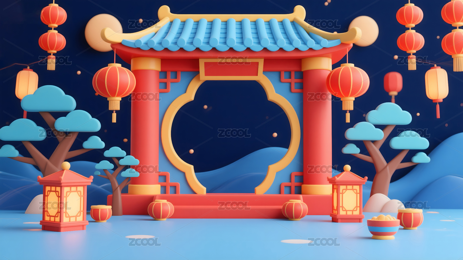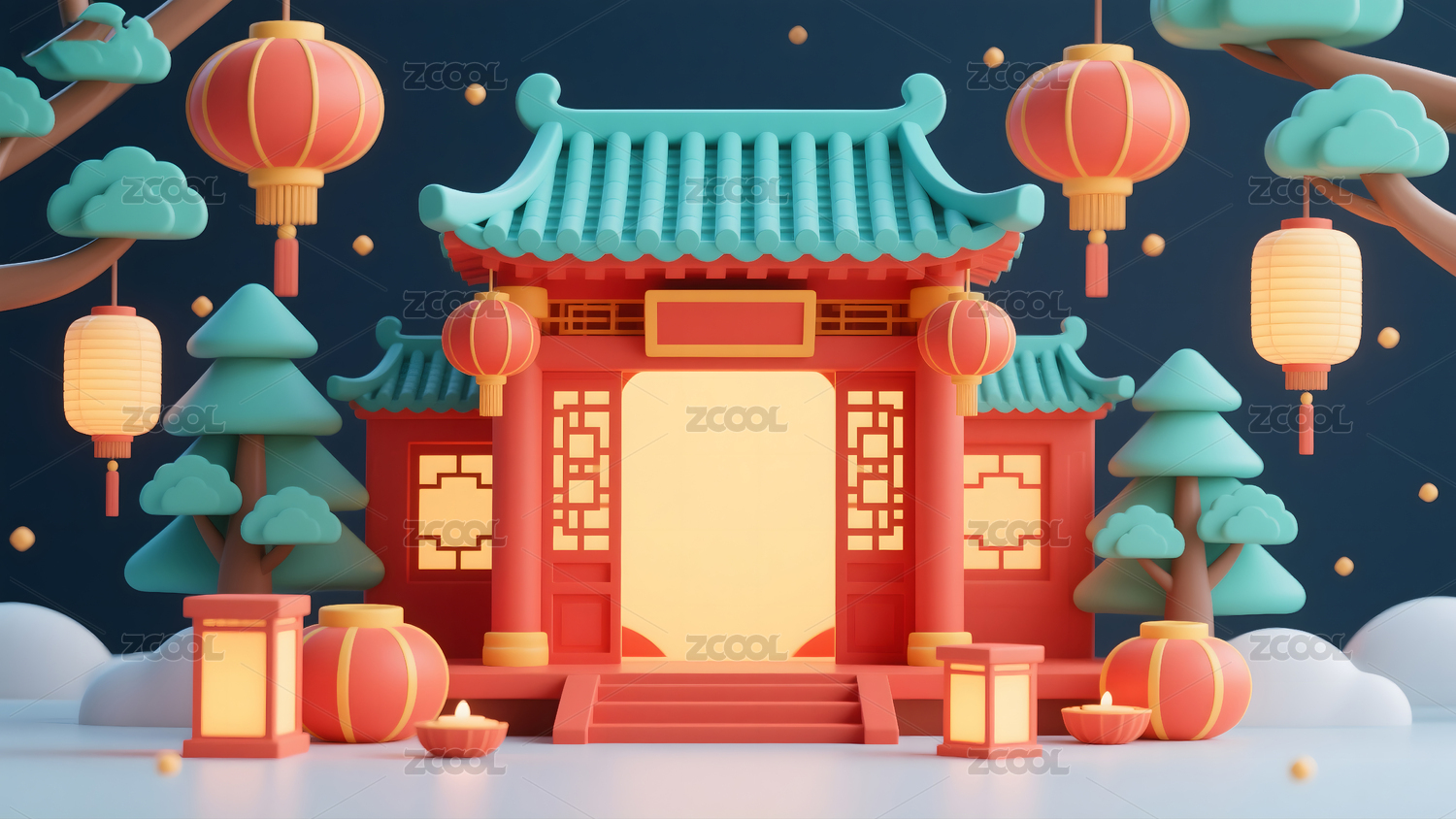 3D卡通国潮风古代建筑红色电商产品展台