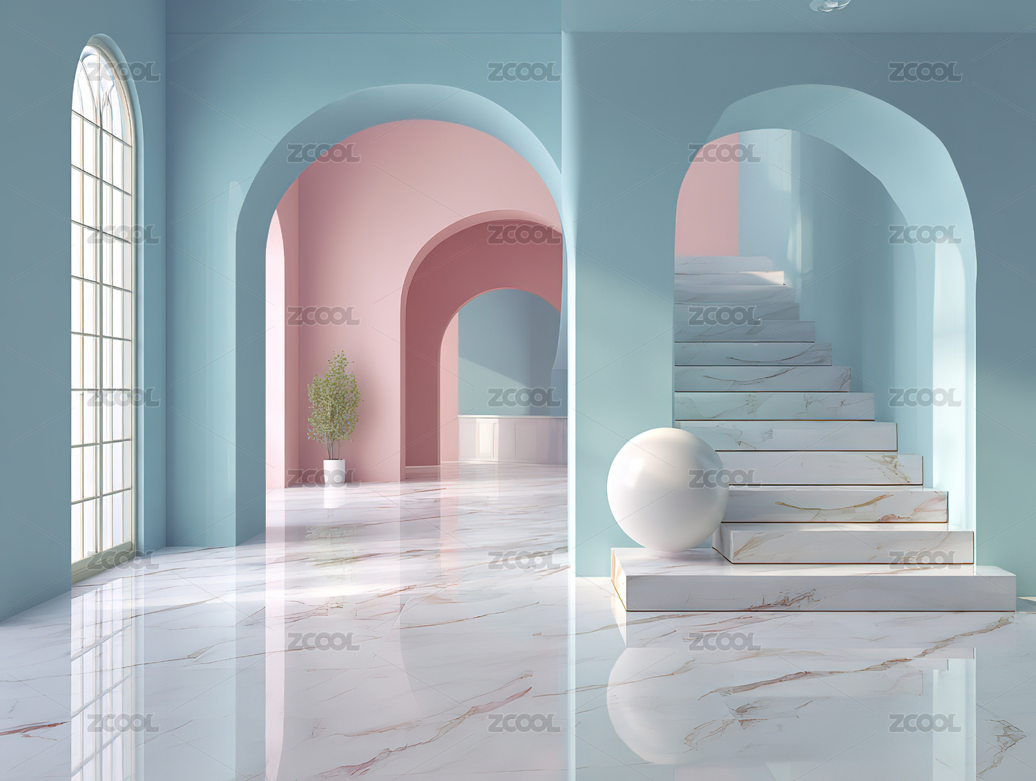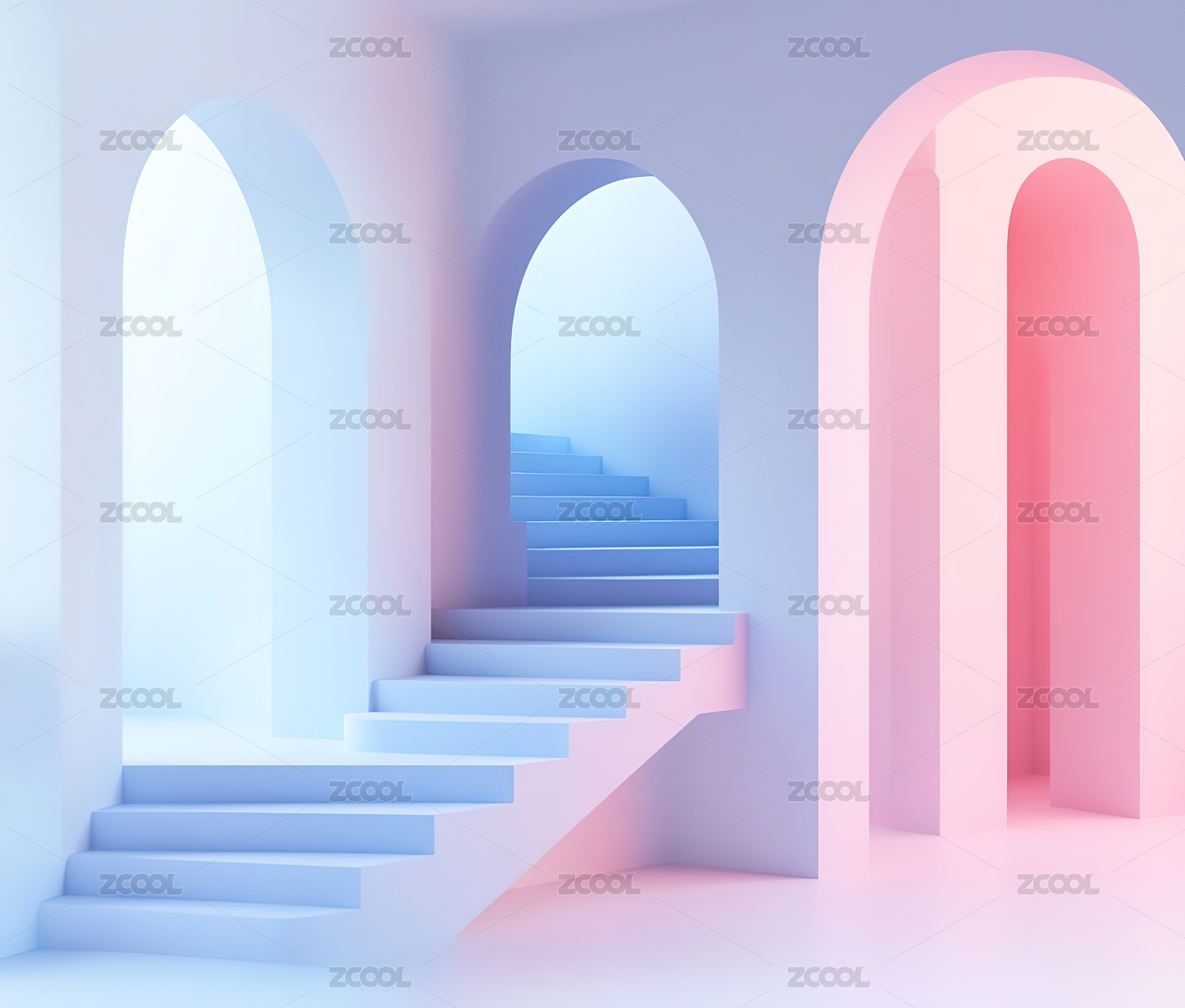 粉色拱门与阶梯的现代空间