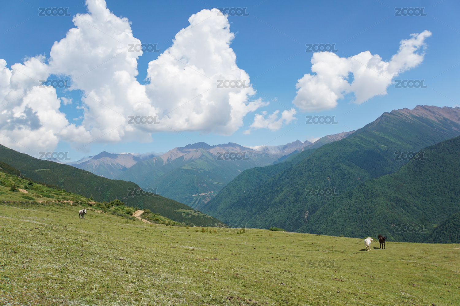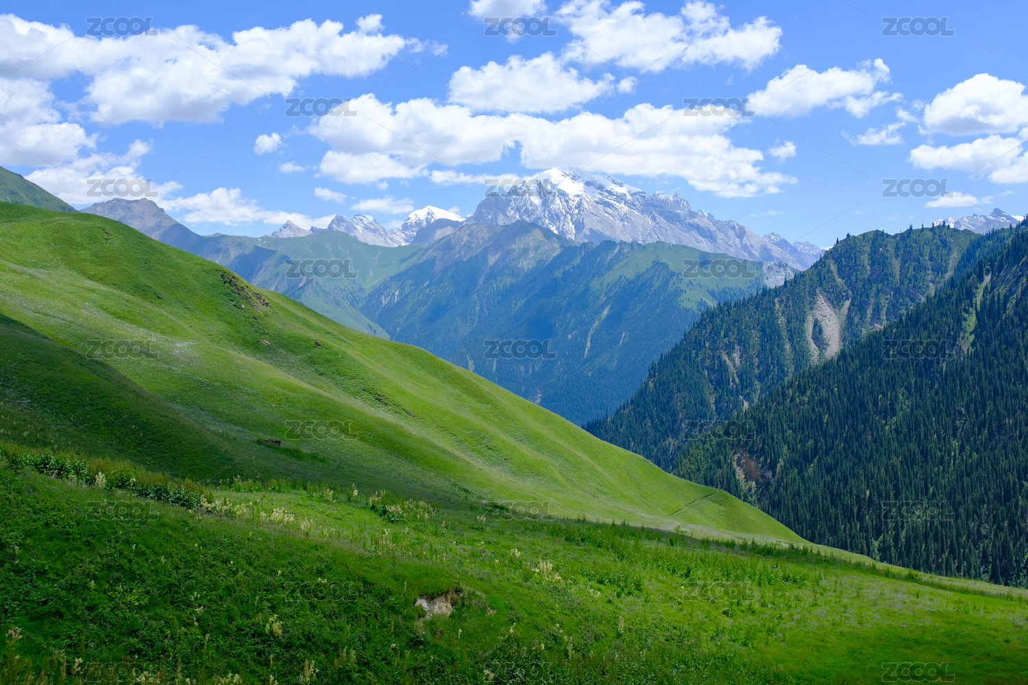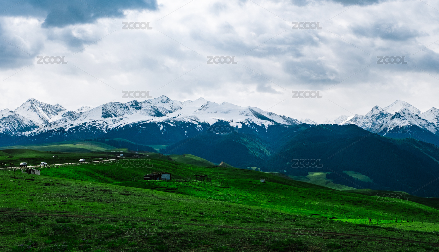 中国新疆乌孙古道高山牧场与远处的雪山
