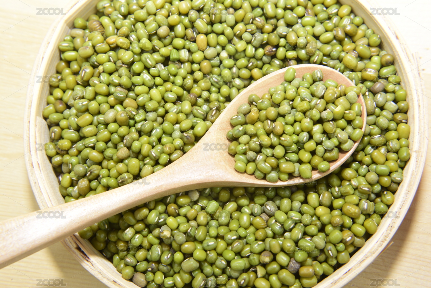 一木勺绿豆放在绿豆背景上