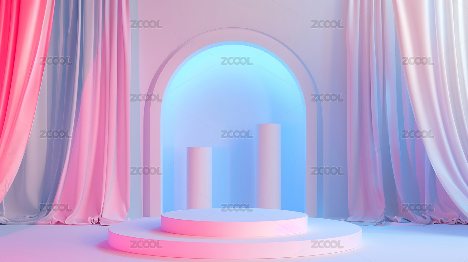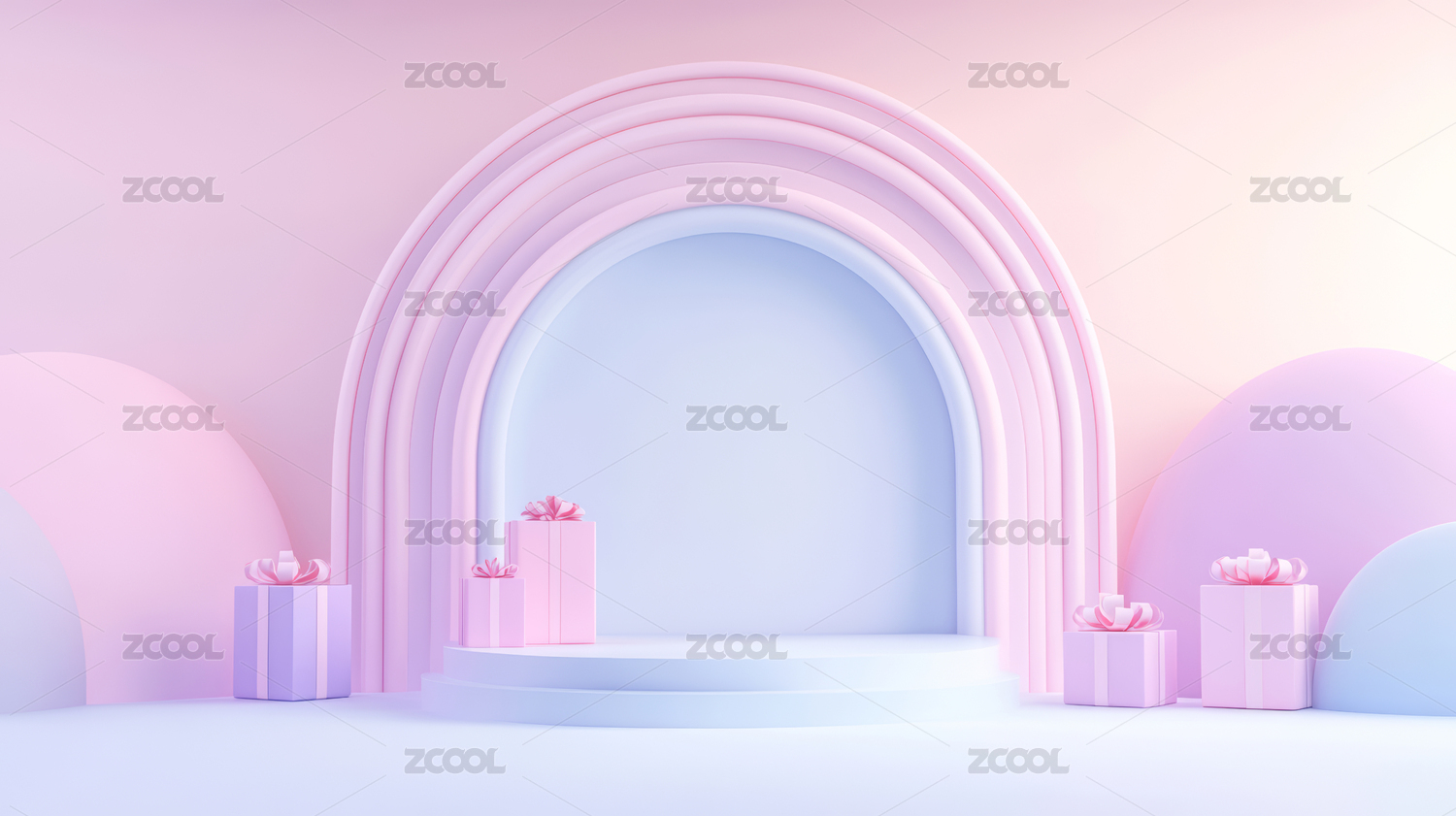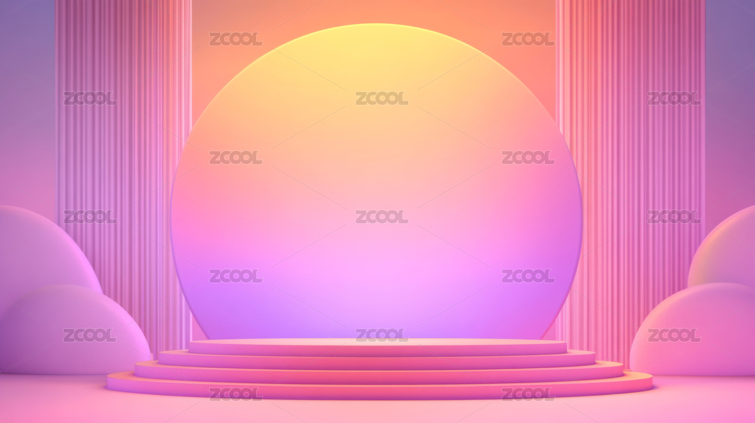 粉色渐变的空展台和基座,圆形和云朵装饰