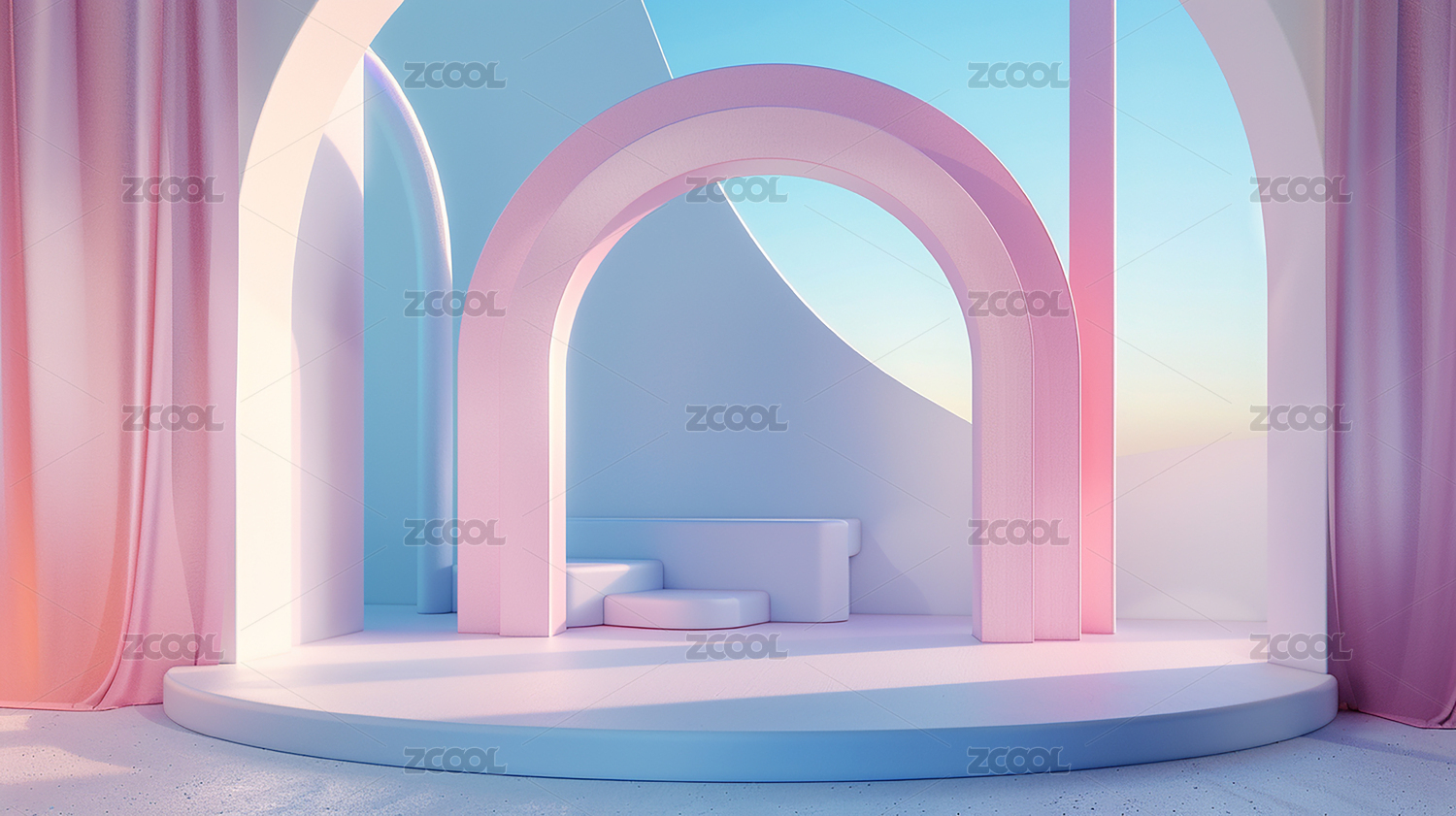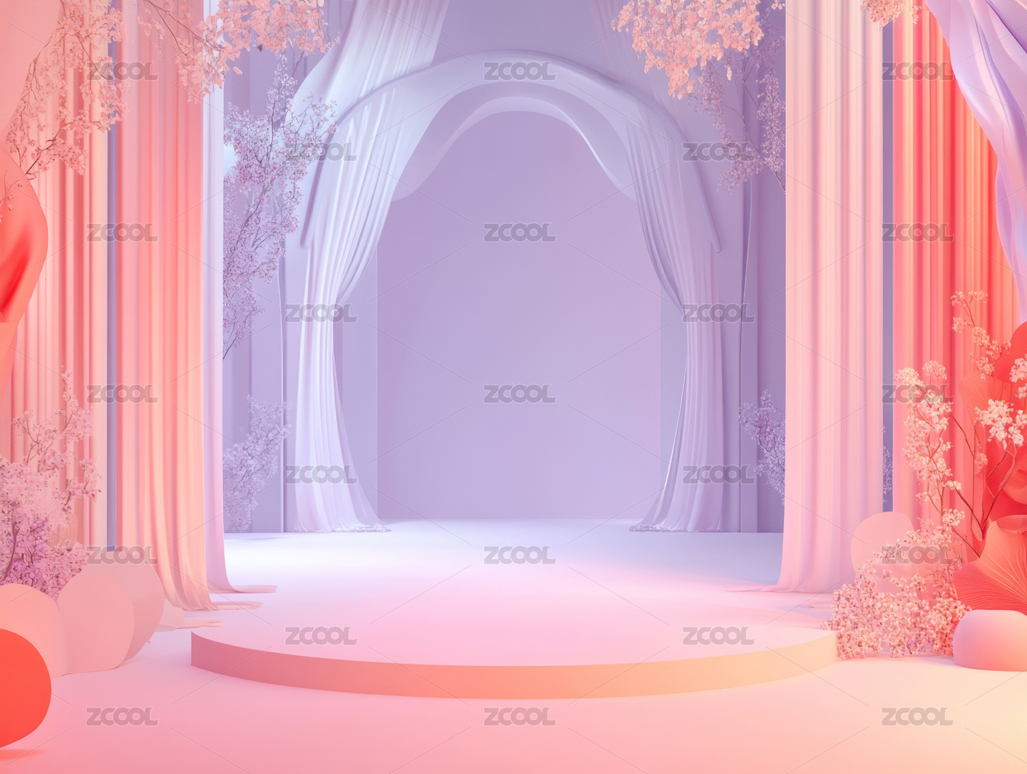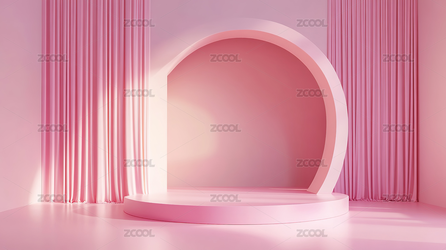 粉色渐变的空展台和基座,圆形和云朵装饰