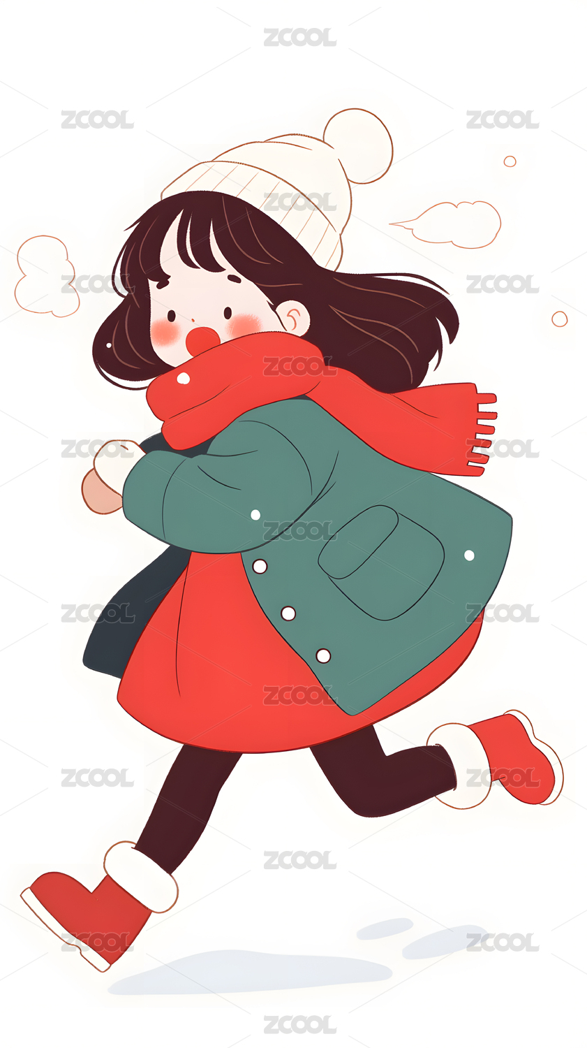 冬天穿着厚衣服奔跑的孩子儿童卡通插画