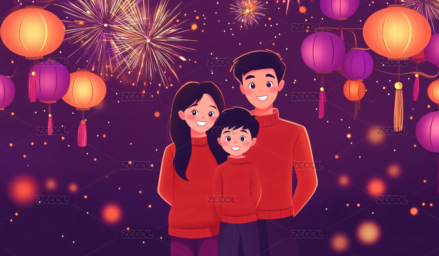 男孩,女孩,春节,新年,节日,夜晚,相伴,烟花,一家人,卡通