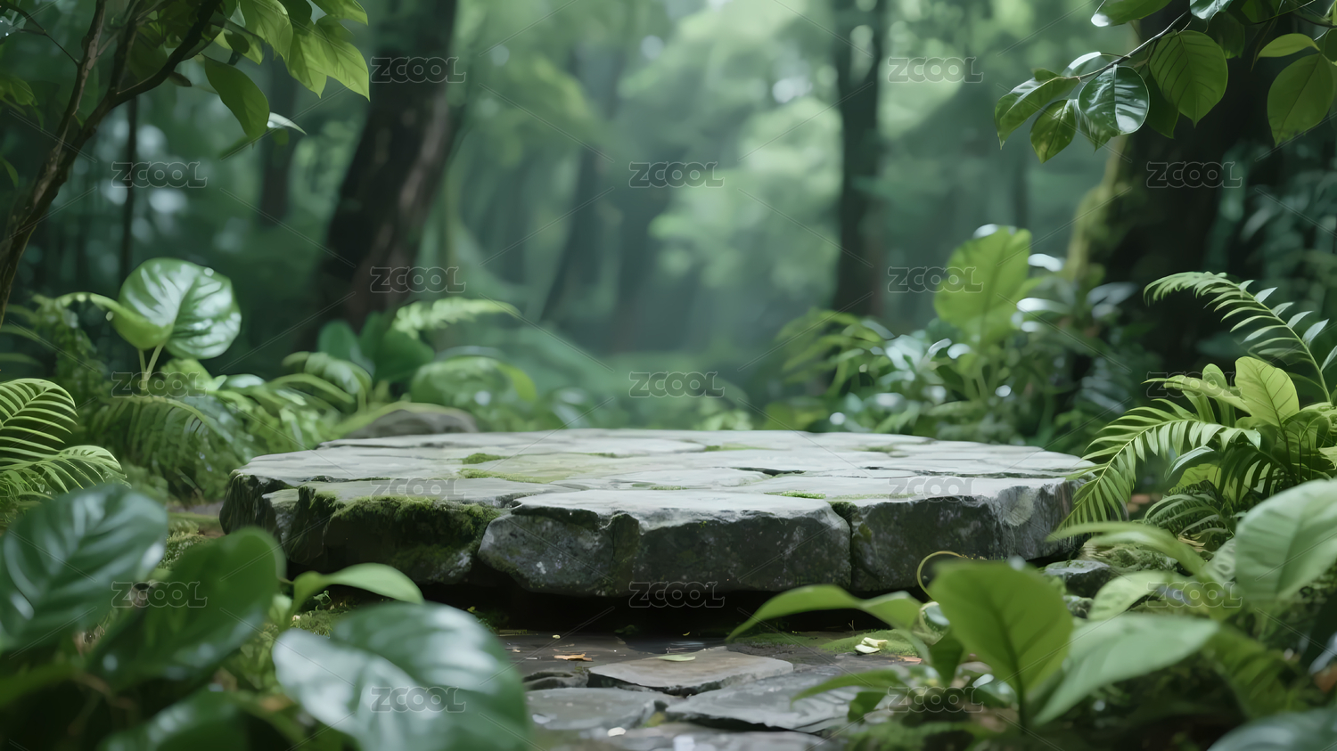 青苔石板森林植物环绕