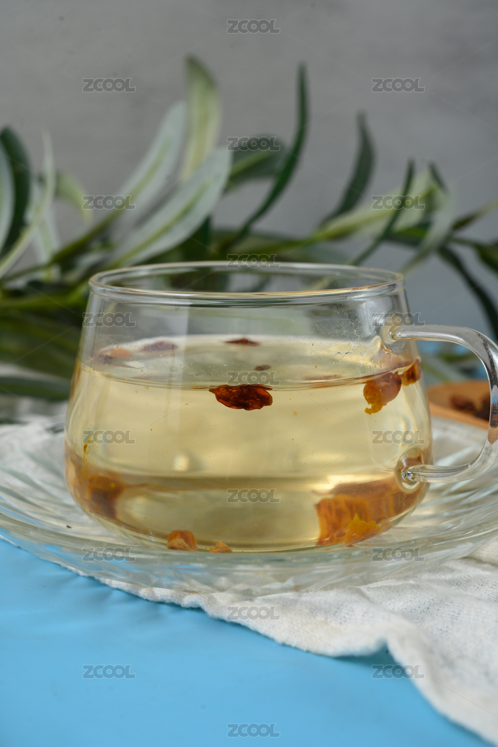 桌面上的杯子里的甘甜可口的山茱萸茶