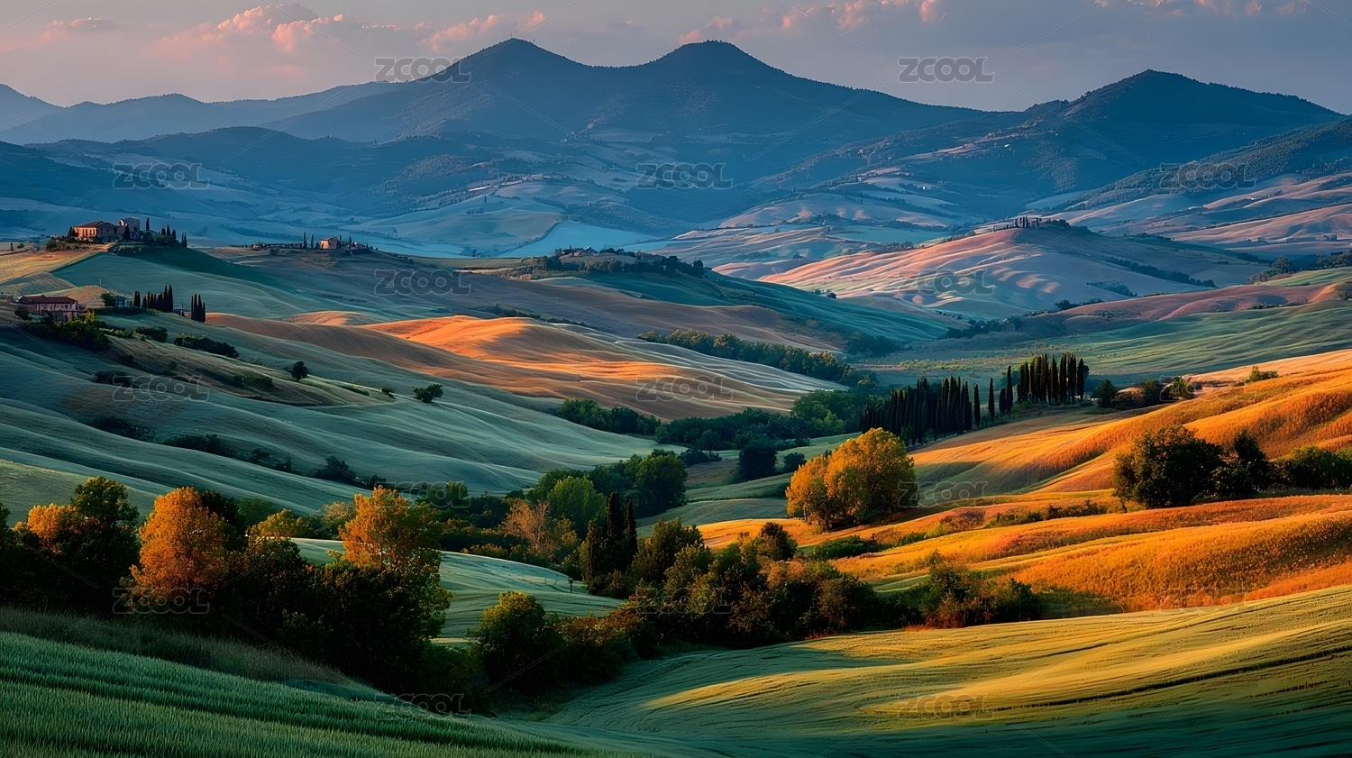 俯瞰大自然丘陵地貌的草地与远山天空背景