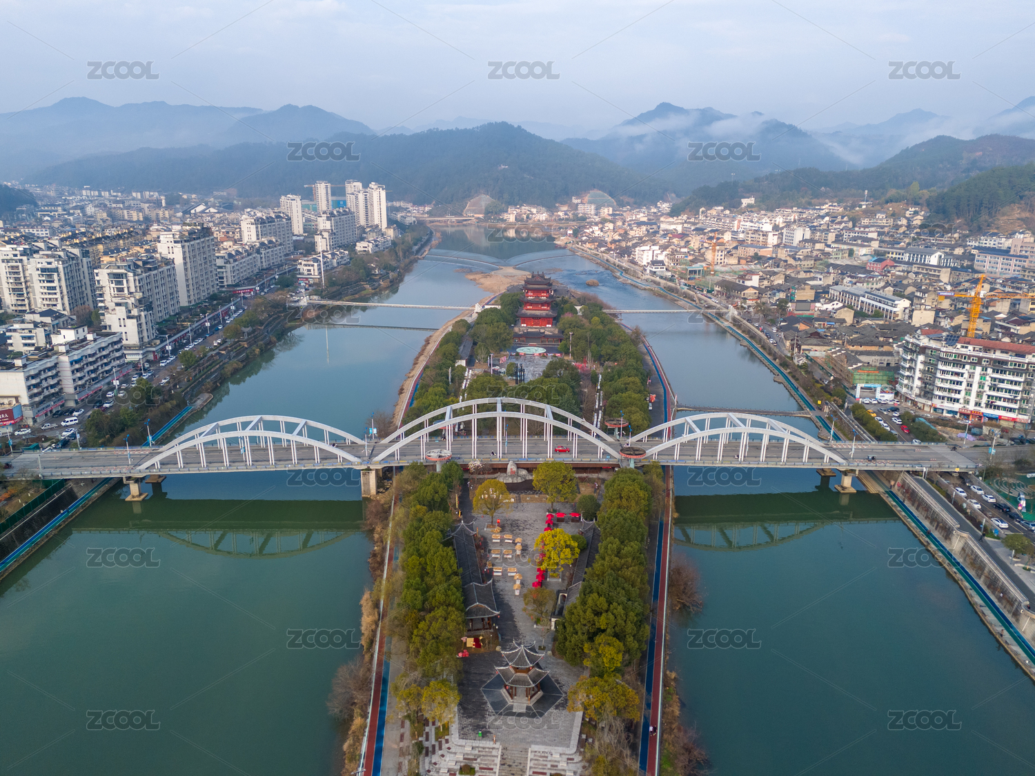 晴好天气下俯拍福建长汀汀江两岸的民居