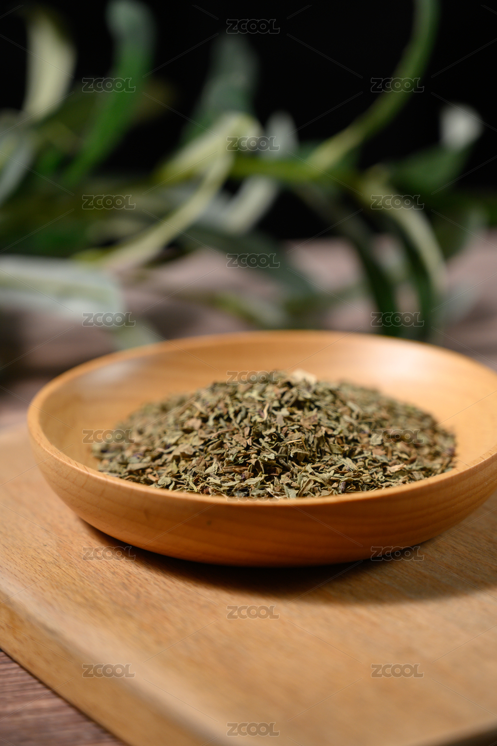 桌面上的盘子里的干爽且香气四溢的罗勒香料