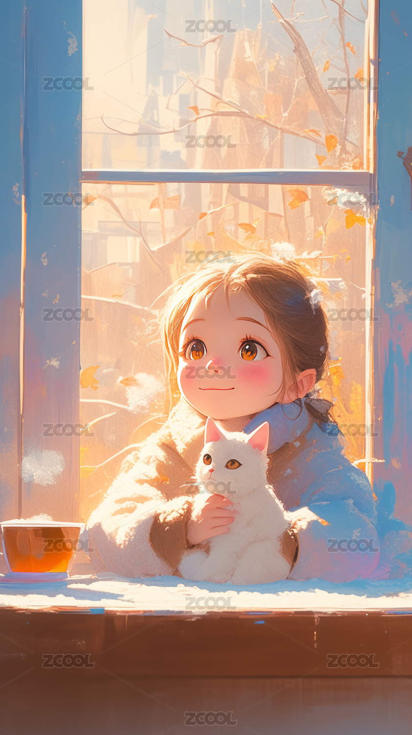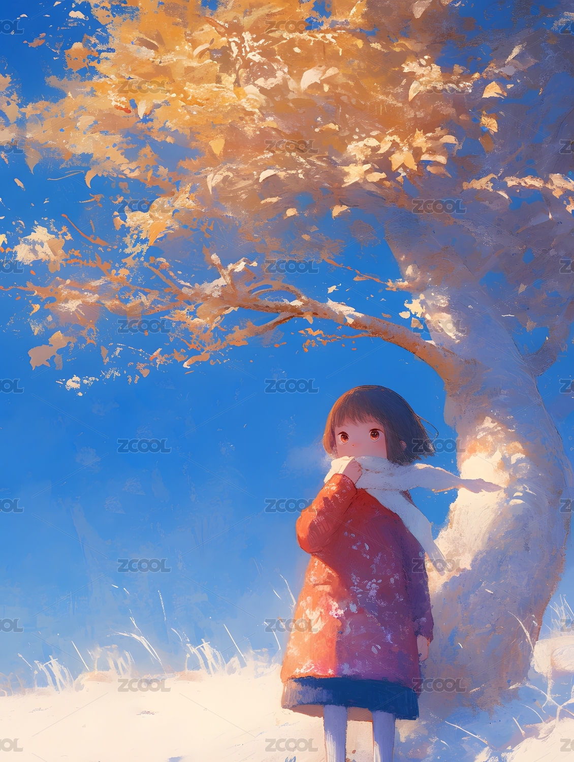 冬季晴朗天气中捧着咖啡杯的小女孩场景插画