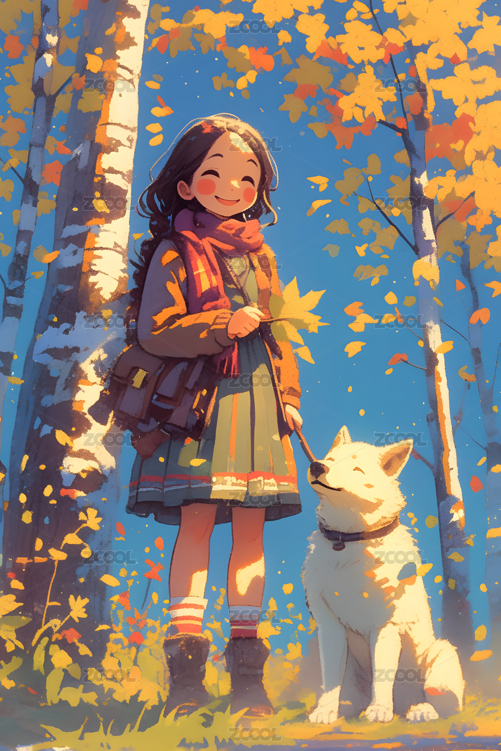 二次元风格深秋枫林下男孩在长椅上看书插画
