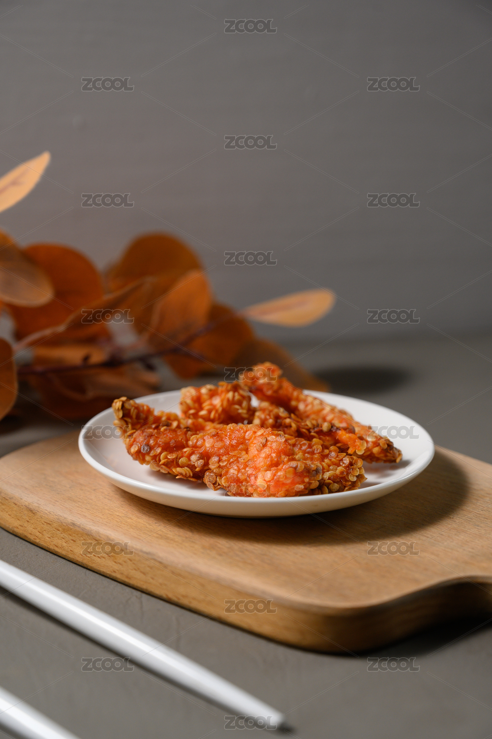 桌面上的盘子里的美味可口雪花炸鸡柳