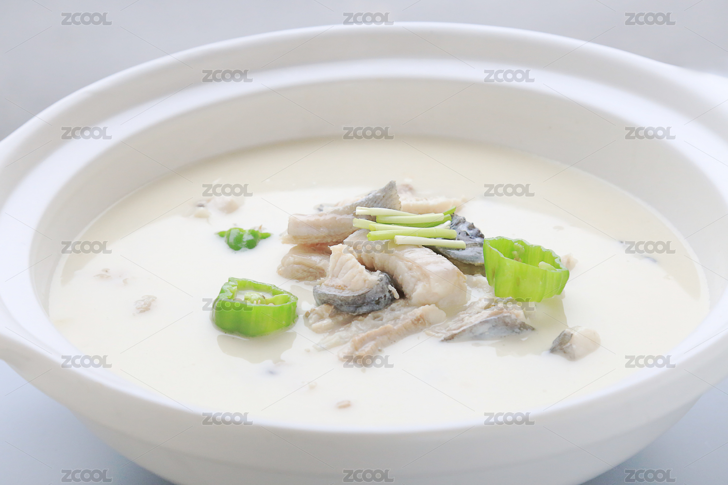 白色背景上白色砂锅里的长江鮰鱼火锅