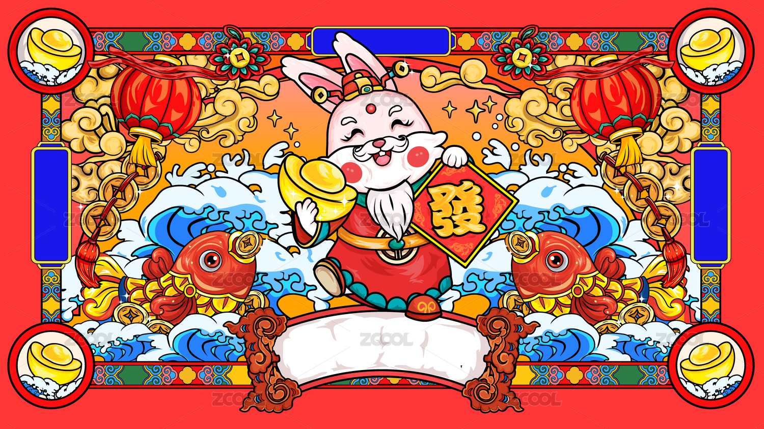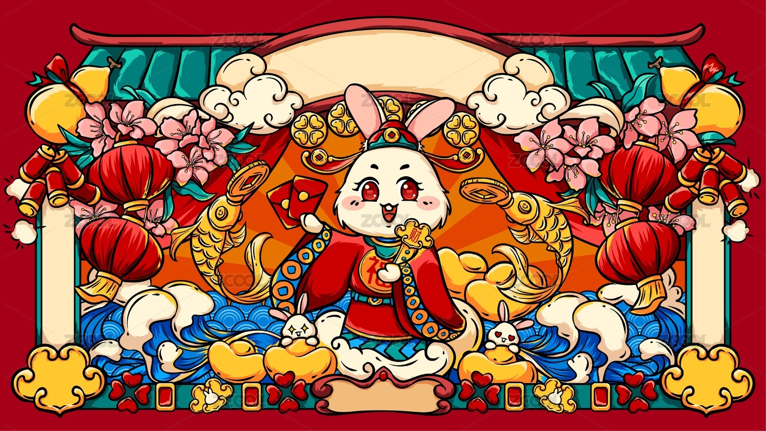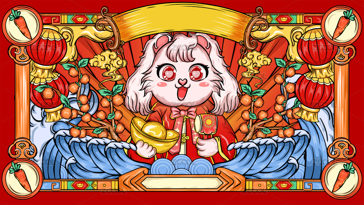 兔年新年春节新春国潮招财手拿元宝插画大吉