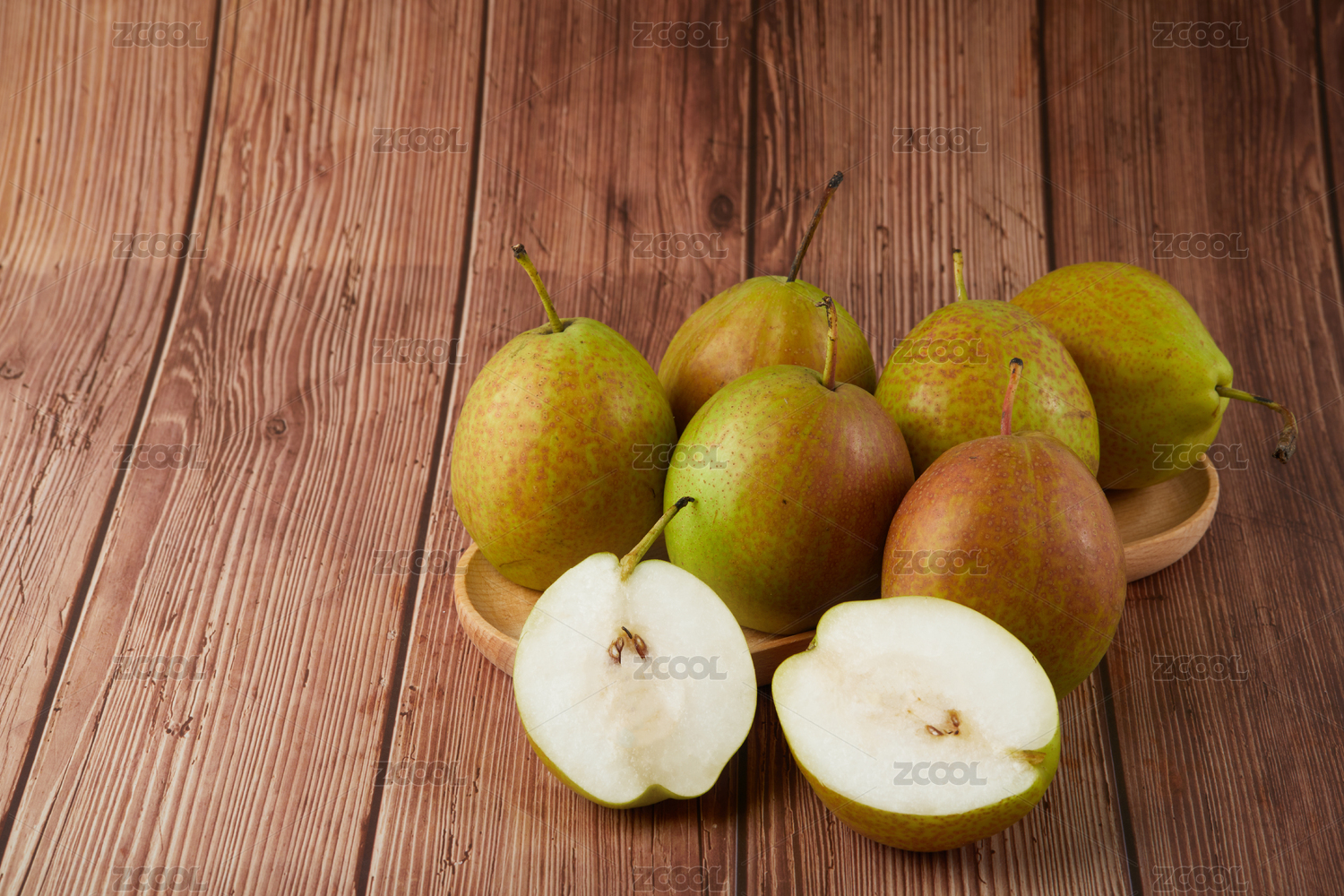 木板桌面上新鲜美味的切开的梨子和完整的旱梨