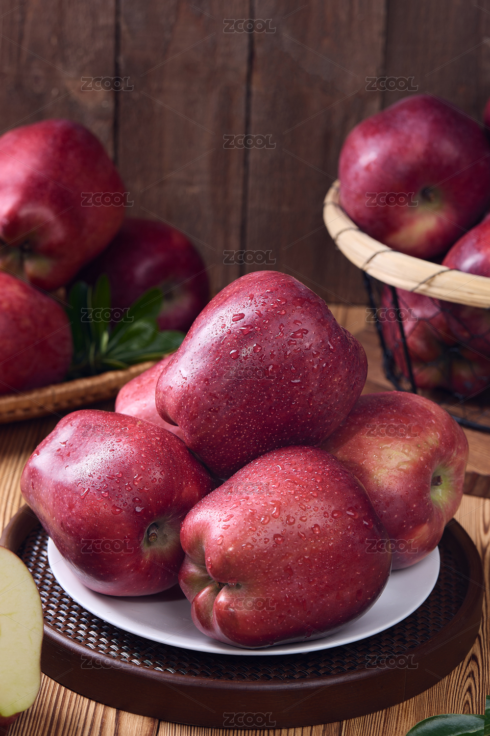 黑色纹底上放着一盘新鲜栖霞红苹果