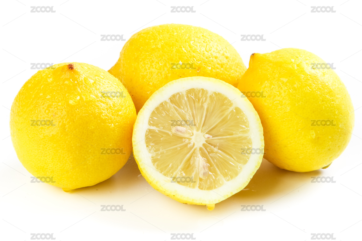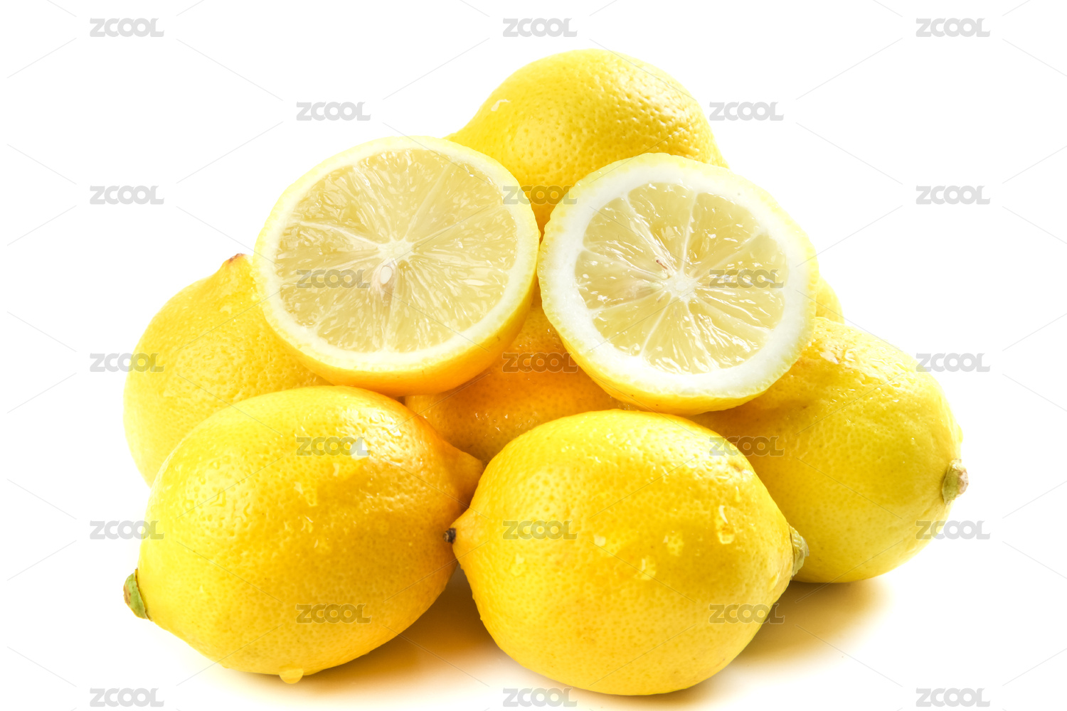 白底上放着一个完整的柠檬和两个半边黄柠檬