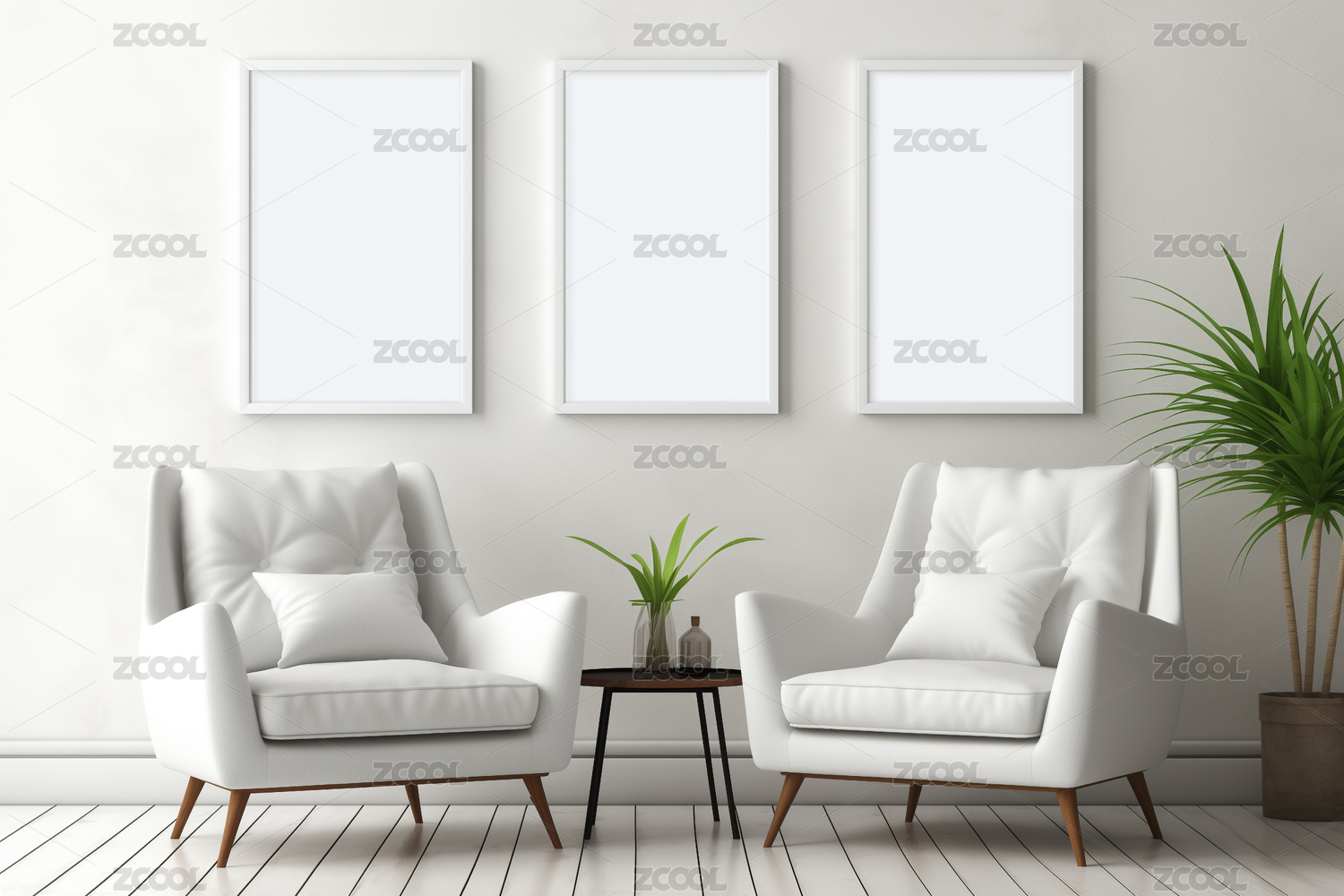 简约的房间座椅背后几张空白的装饰画
