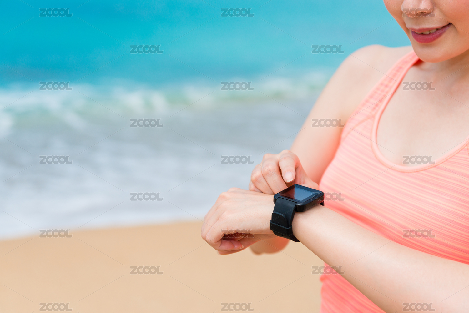 中国女性美女运动前操作运动手表运动手环智