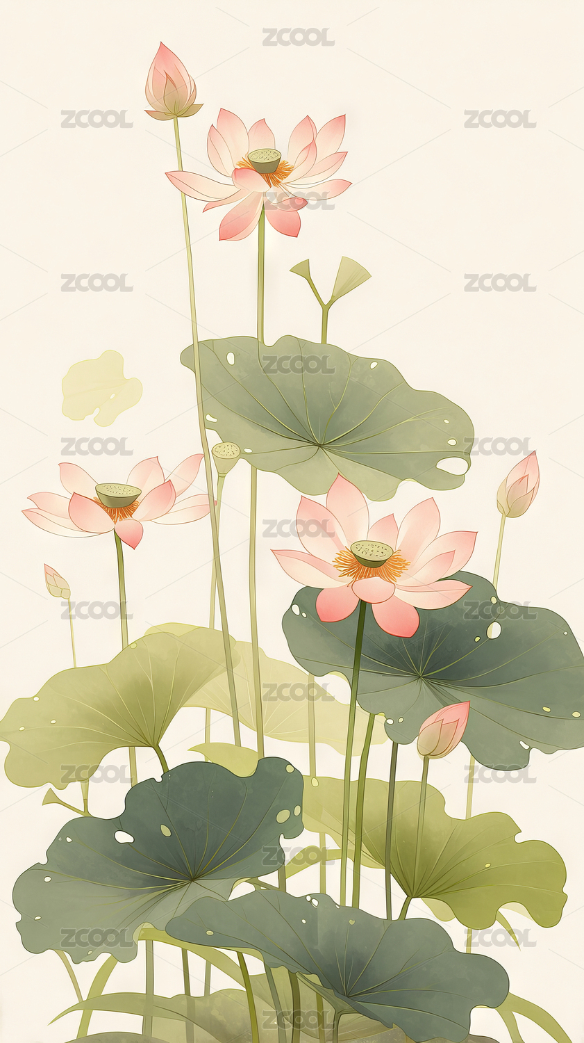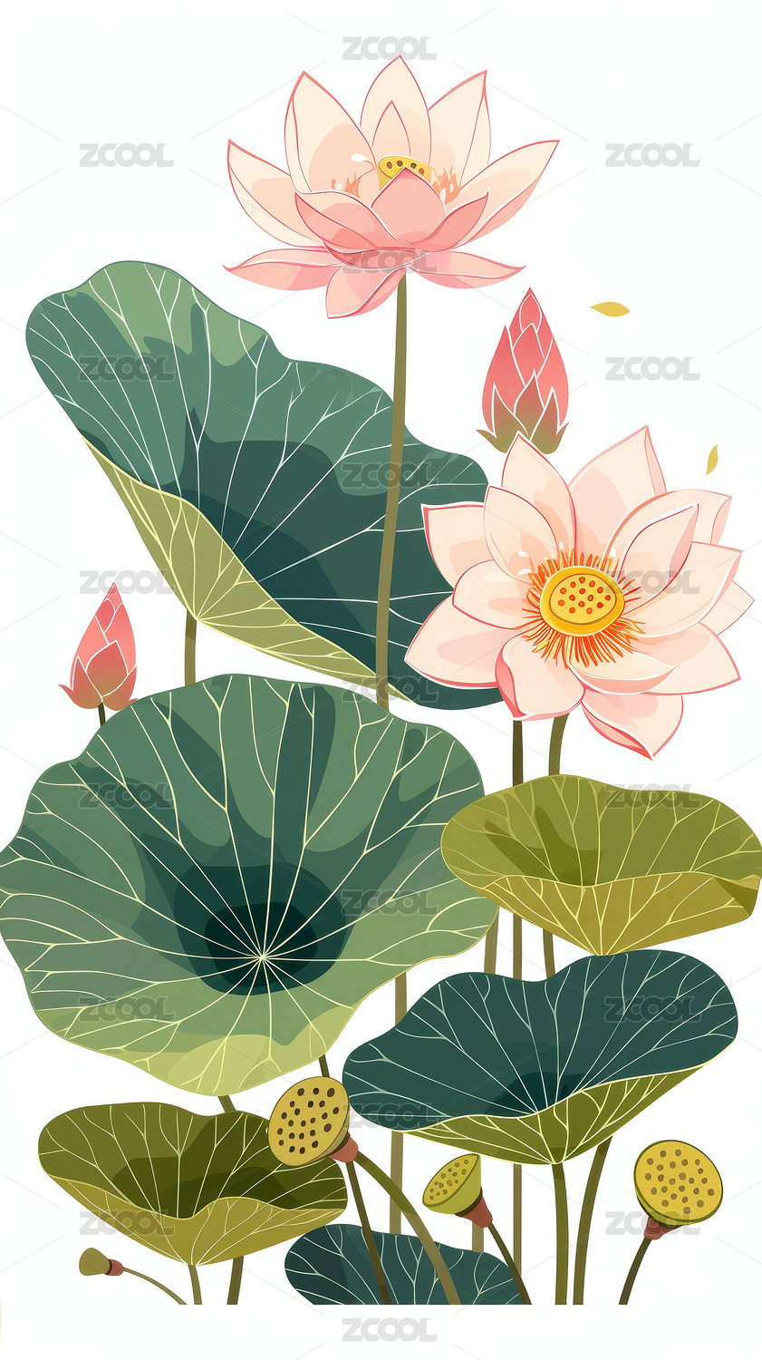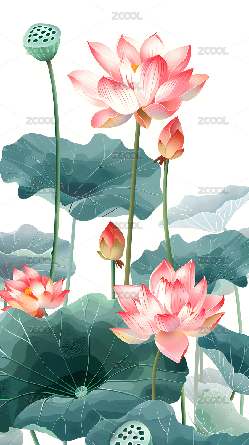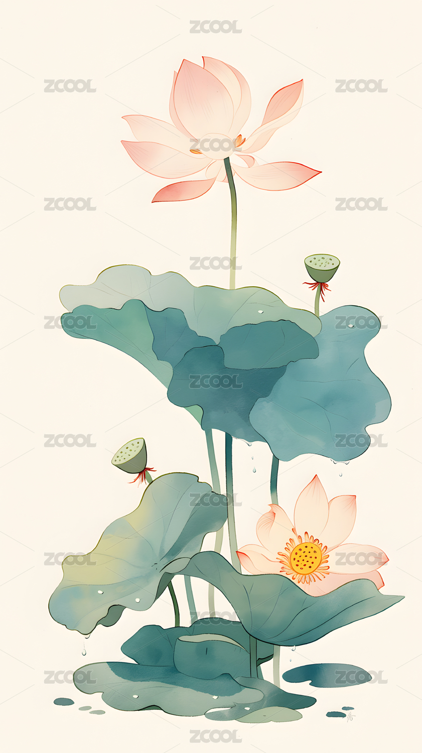 国风荷花莲蓬荷叶插画元素,立夏节气池塘荷