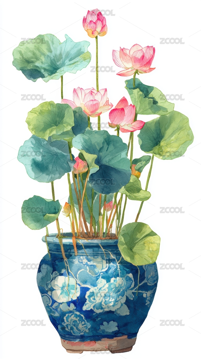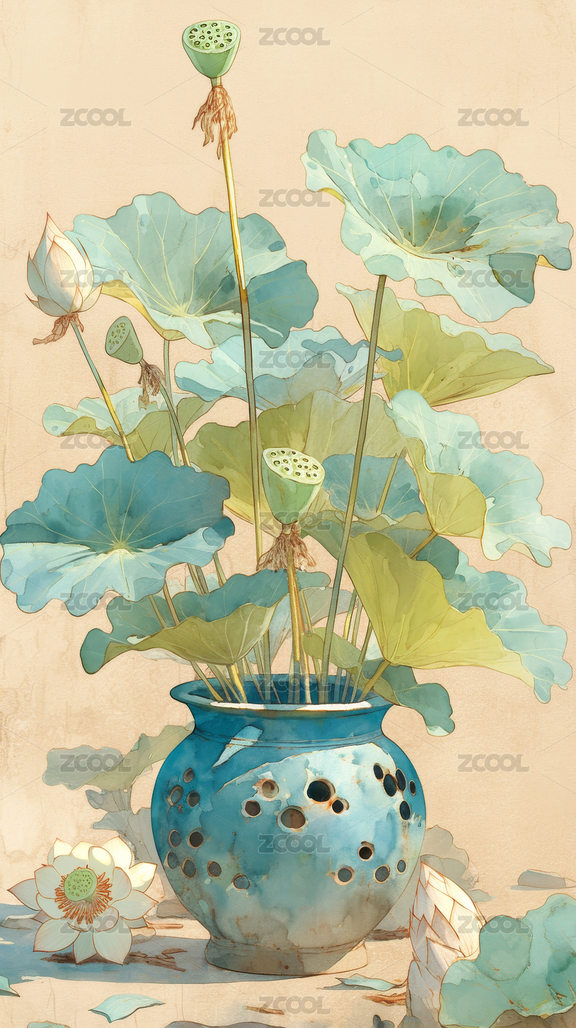 花瓶,青花瓷,瓶,荷花,荷叶,清新,简约,绘画,手绘,插画