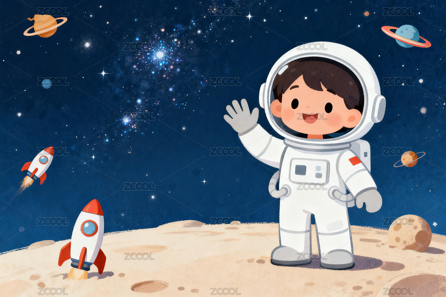 卡通宇航员太空挥手场景
