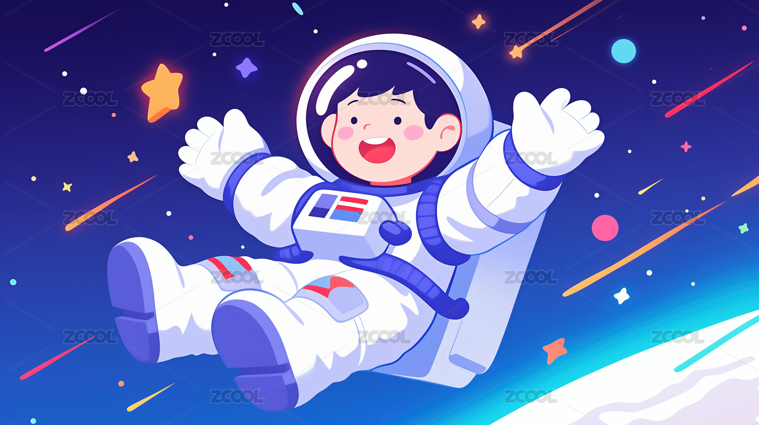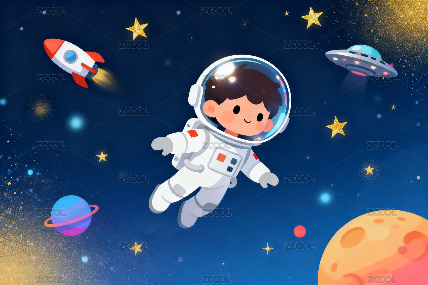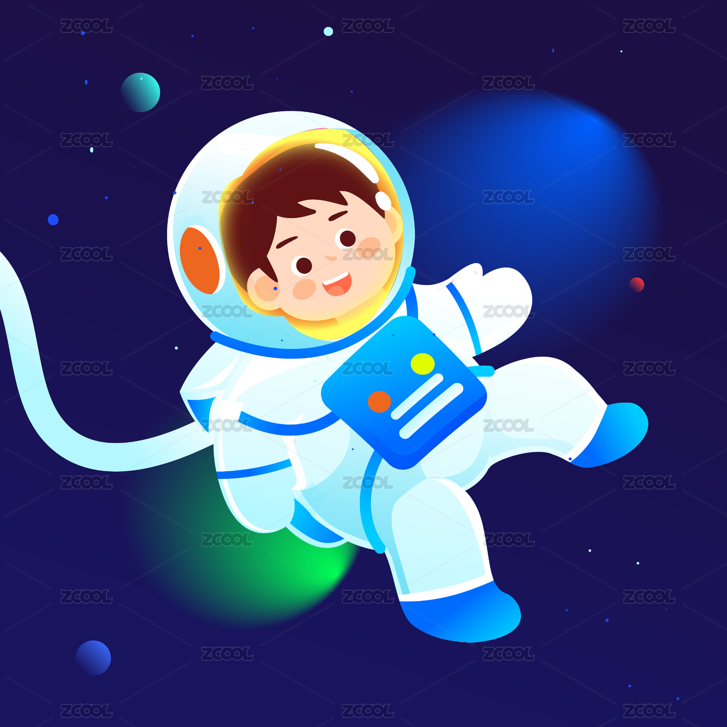在太空中穿着宇航服开心遨游的卡通男孩