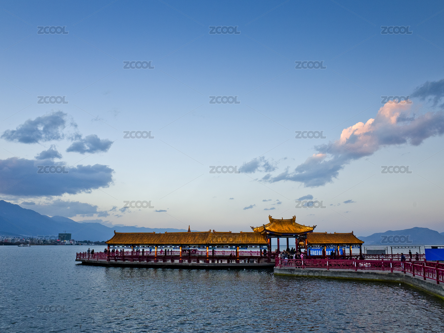 中国云南省大理市海心亭黄昏和洱海上的游艇