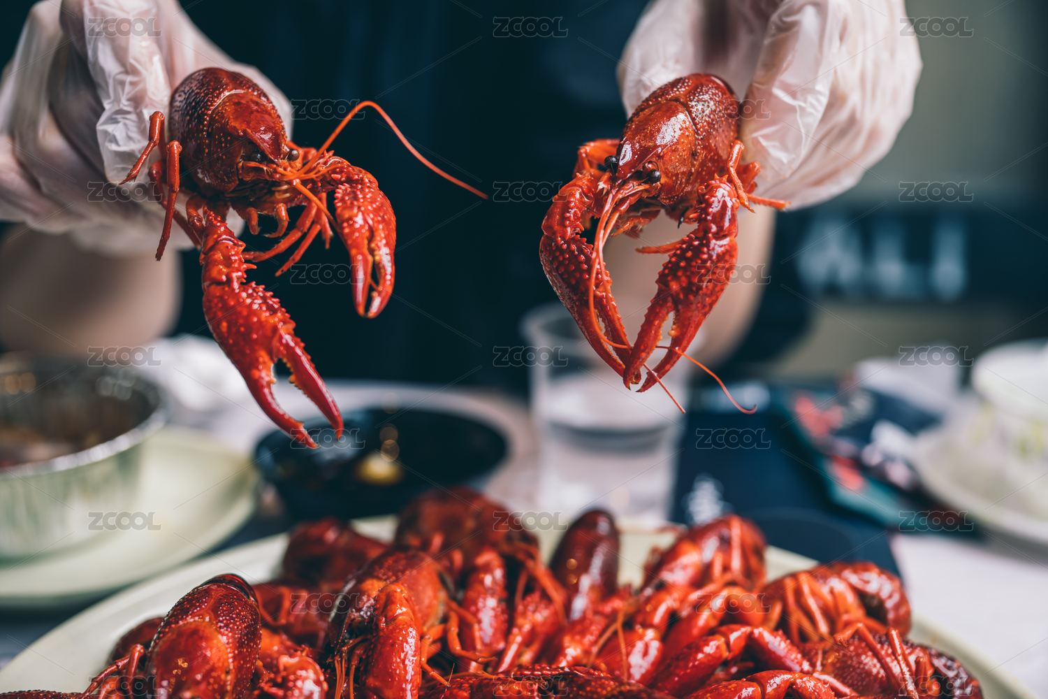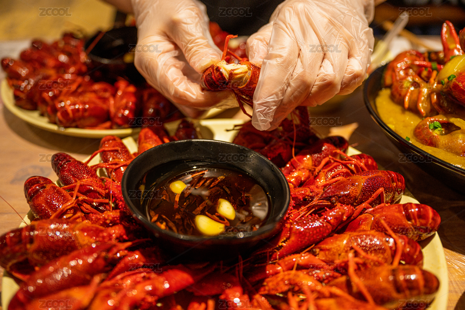 餐馆内一个人用手剥开蒸熟的小龙虾