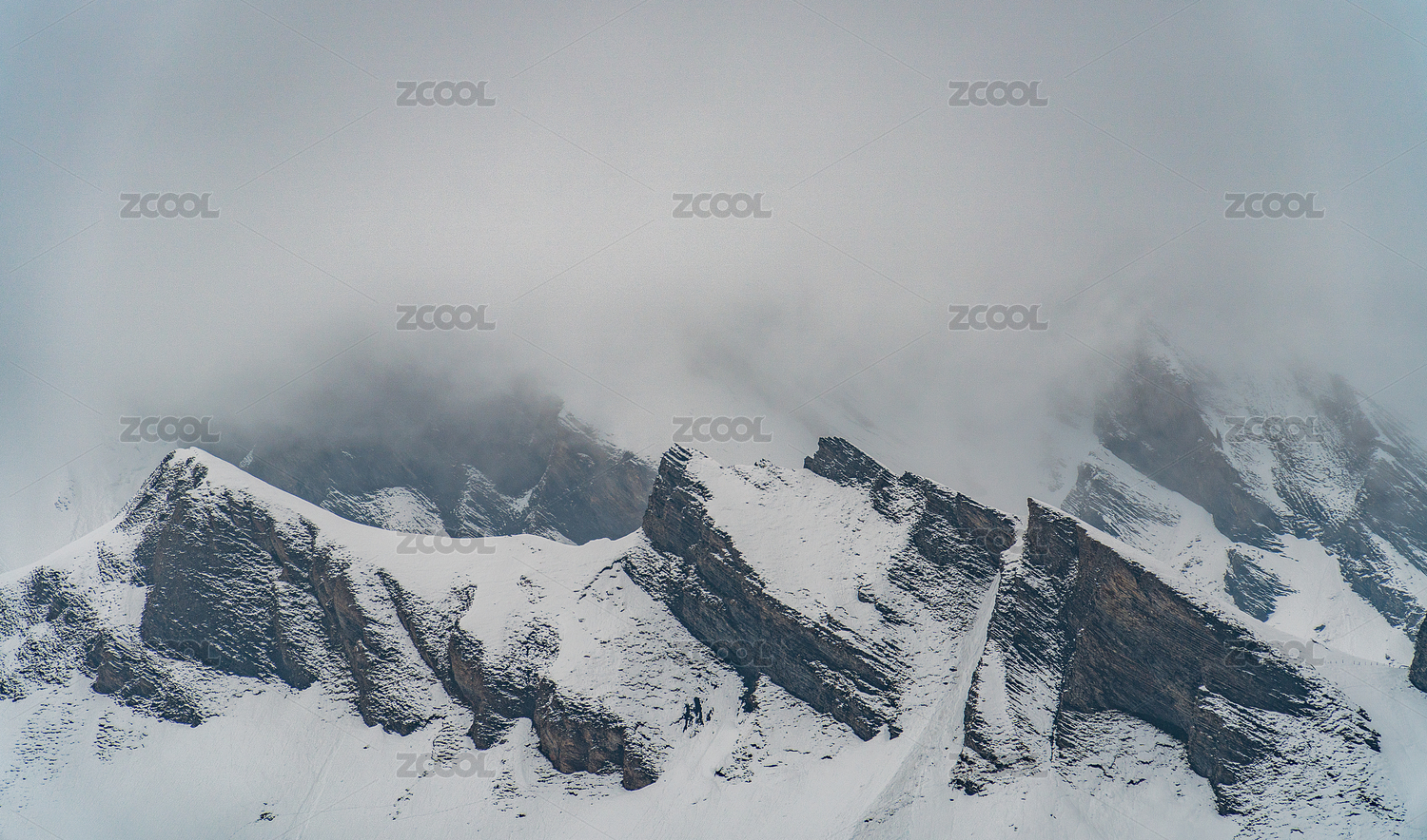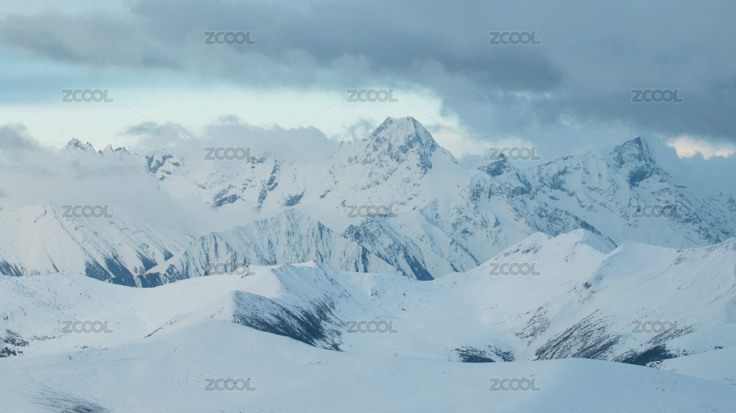 中国新疆夏特峡谷的雪峰上云雾弥漫