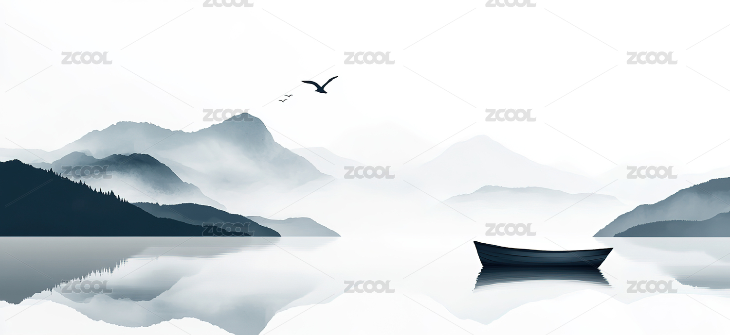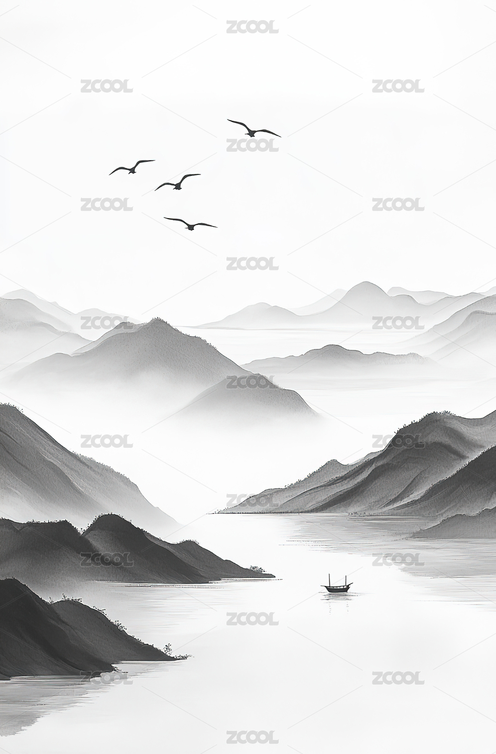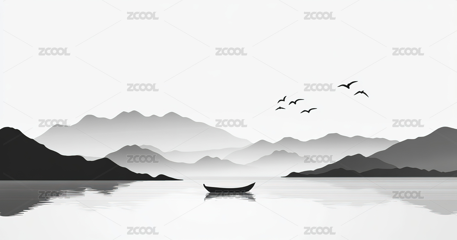 水墨画,山水画,中国画,写意画,风景画,山,水,船,平静,宁静