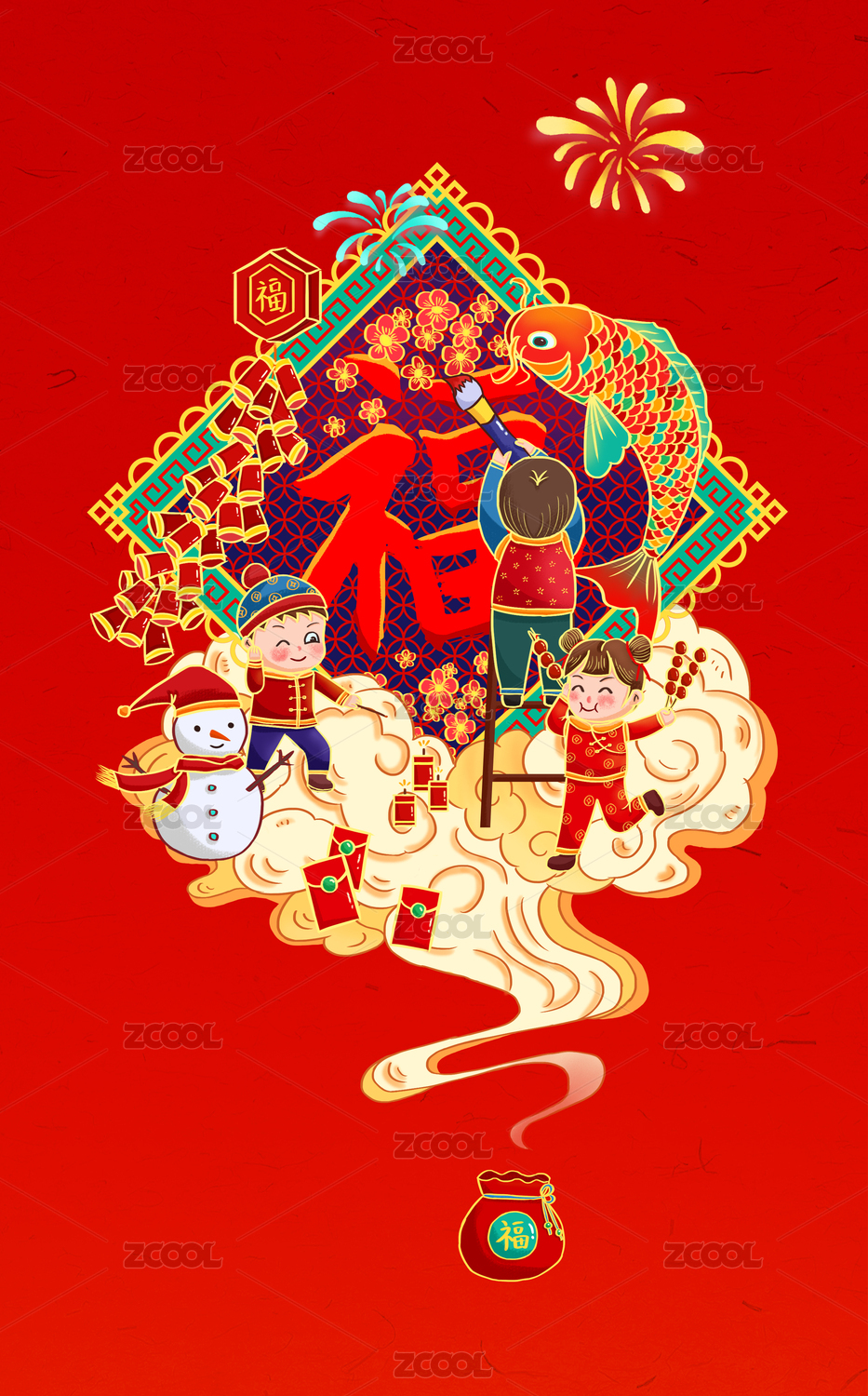 春节孩子们写福字放鞭炮堆雪人贺新年