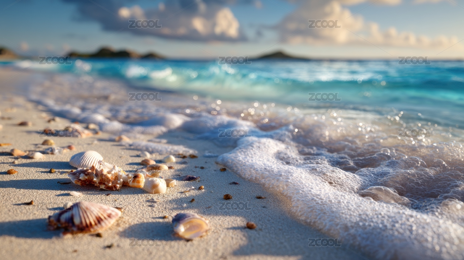 沙滩上的贝壳与轻柔海浪