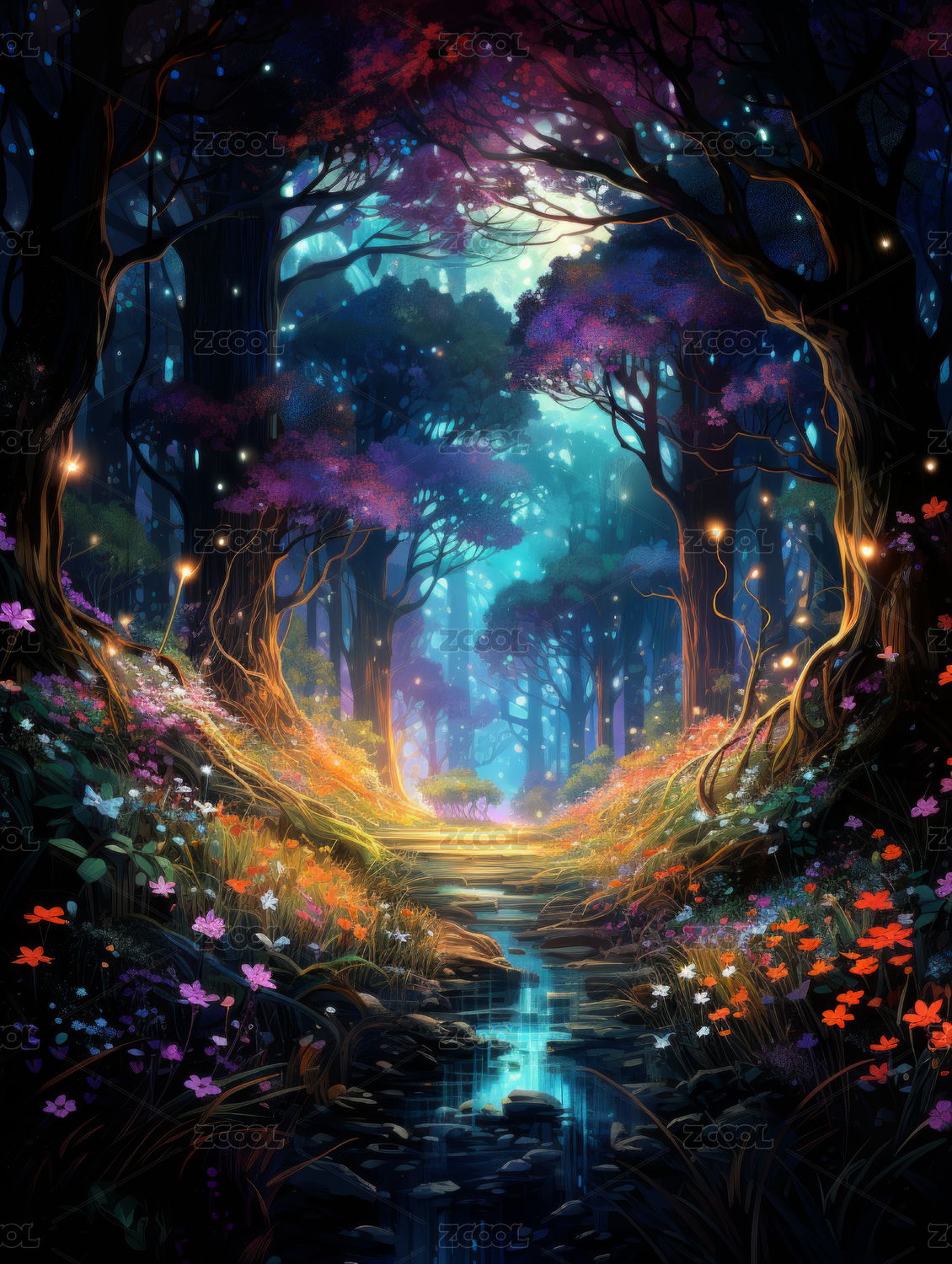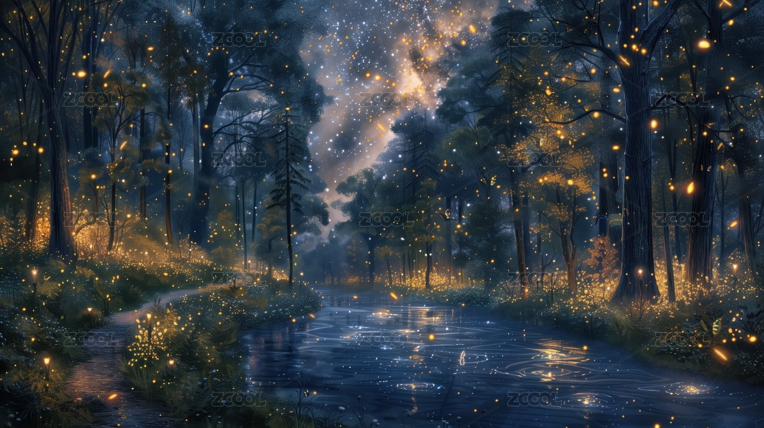 森林夜晚星空河流萤火虫神秘宁静唯美插画