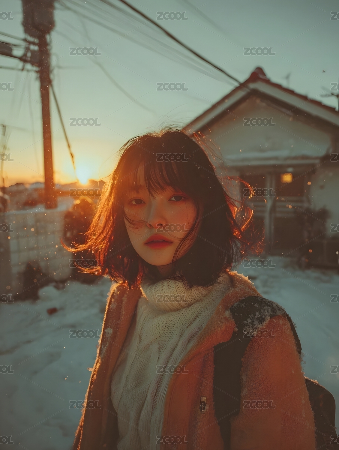 冬季假期旅行途中,被风吹起头发的亚洲女子