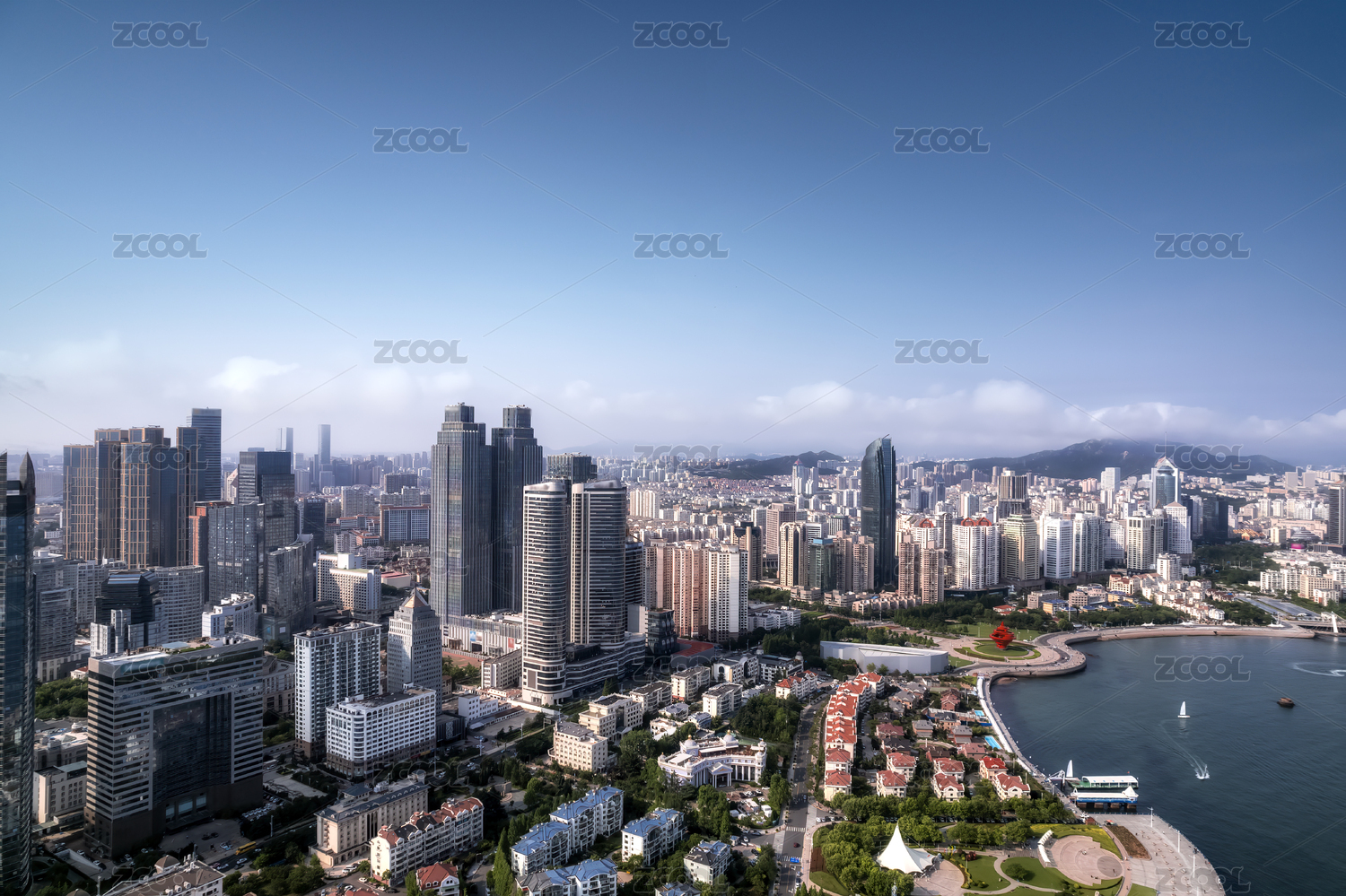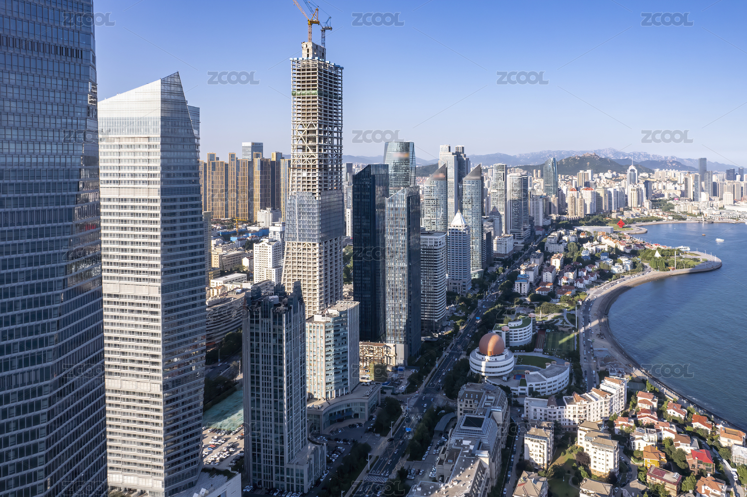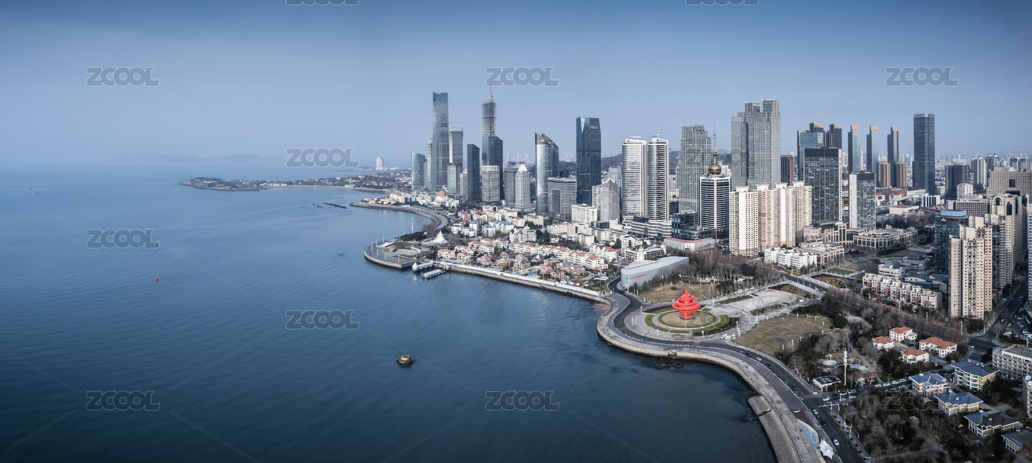 航拍青岛海岸线摩天大楼